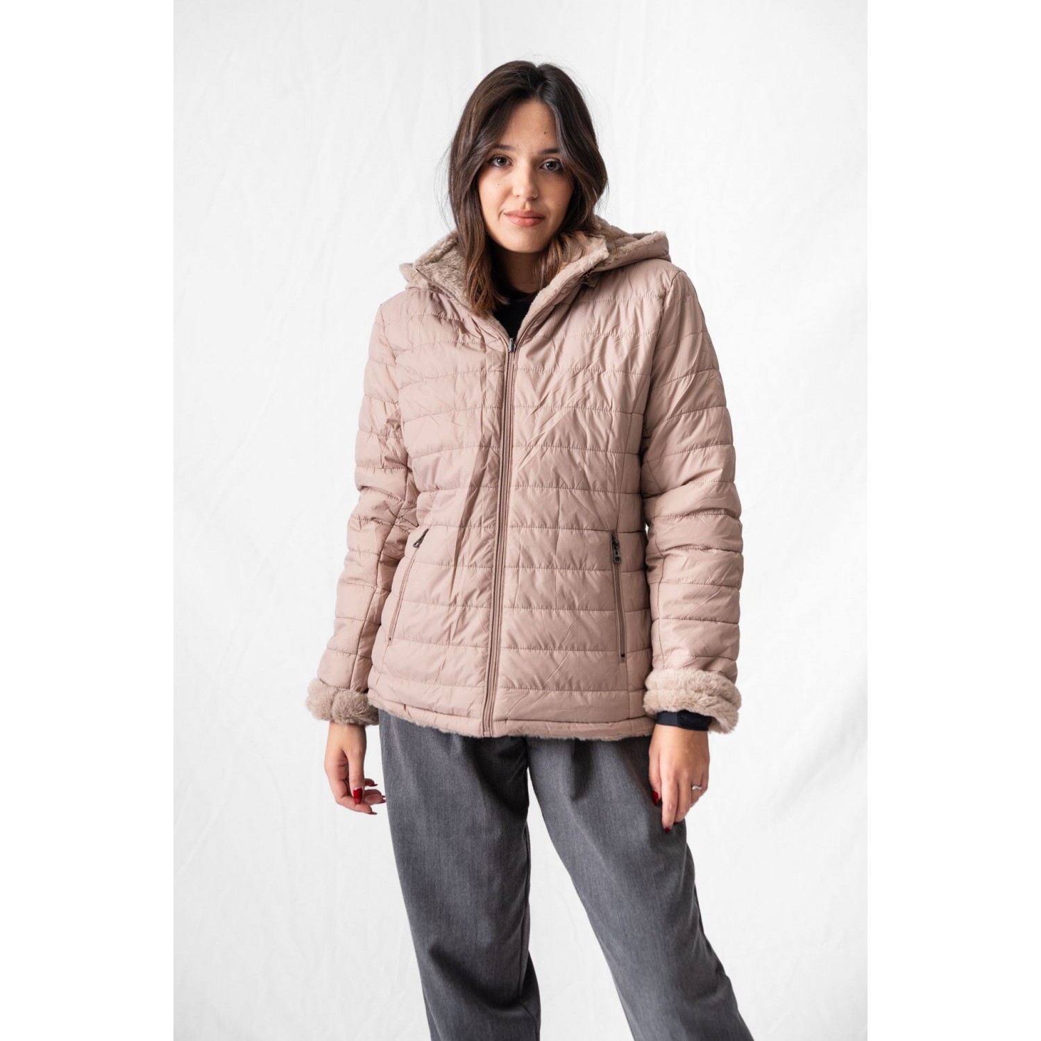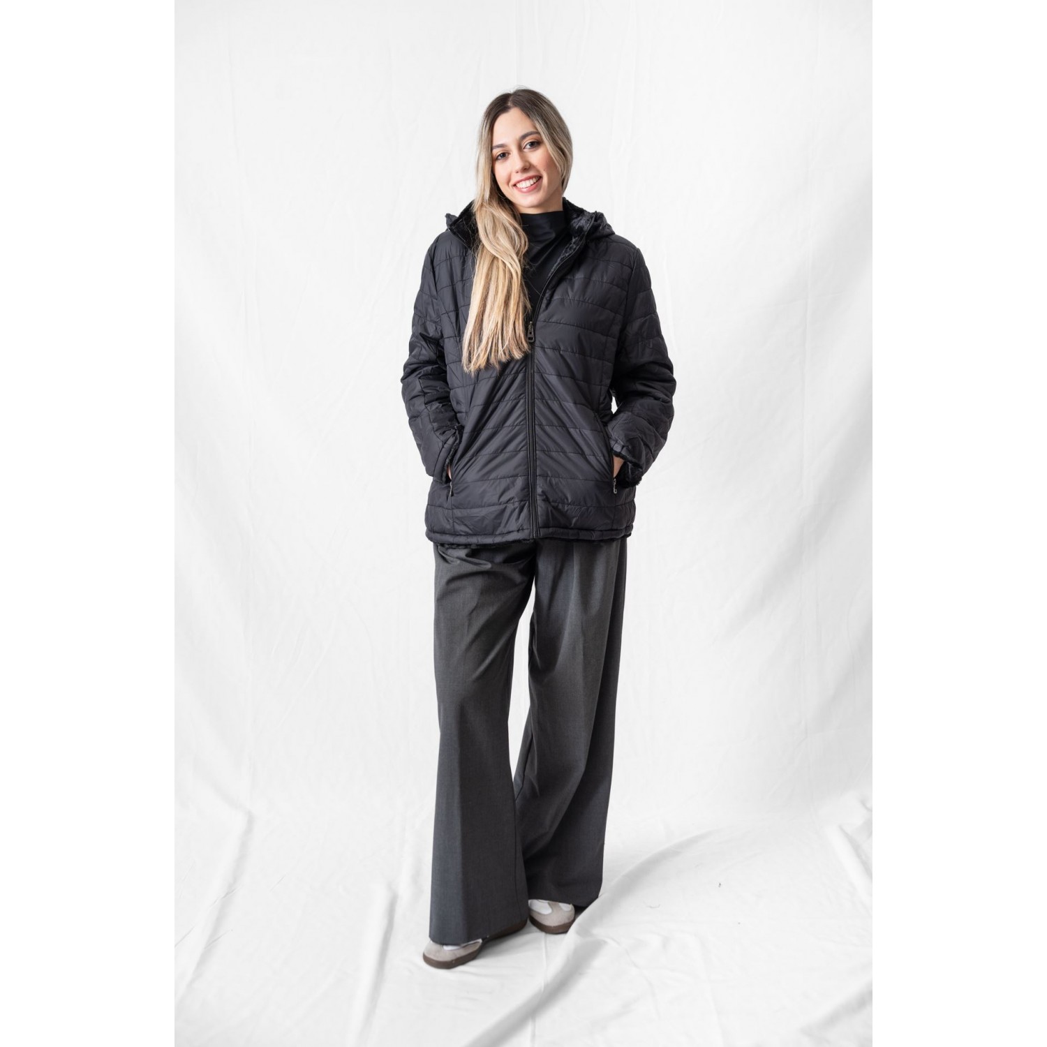 Reversible jacket with detachable hood and side pockets. A jacket is the most easy-to-wear everyday outerwear you can wear this winter. It really goes with everything: skirts, dresses or pants of any color! The most important thing to pay attention to is the length of your jacket. So if you have high-waisted wide-leg pants, a maxi skirt, or an A-line dress, it's better to opt for a shorter jacket.