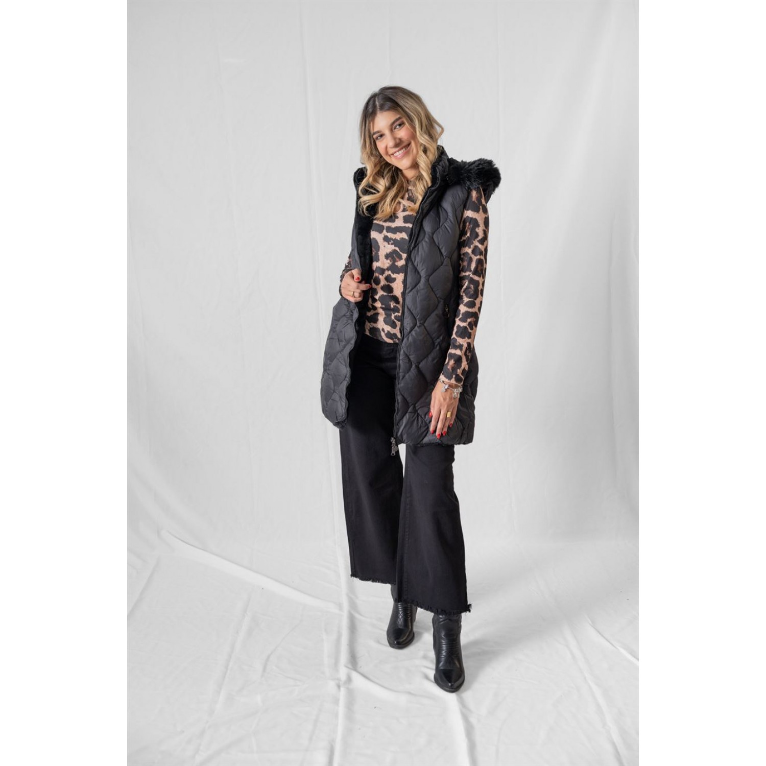 Sleeveless double-sided jacket with detachable hood. It has side pockets. Jackets in the winter are absolutely essential for a complete outfit for a woman. Whatever style, pattern, color they have, they can be combined correctly and give a fantastic result! Sleeveless women's jackets are a great solution for the colder days ahead. They can be worn with almost anything and create stunning outfits.