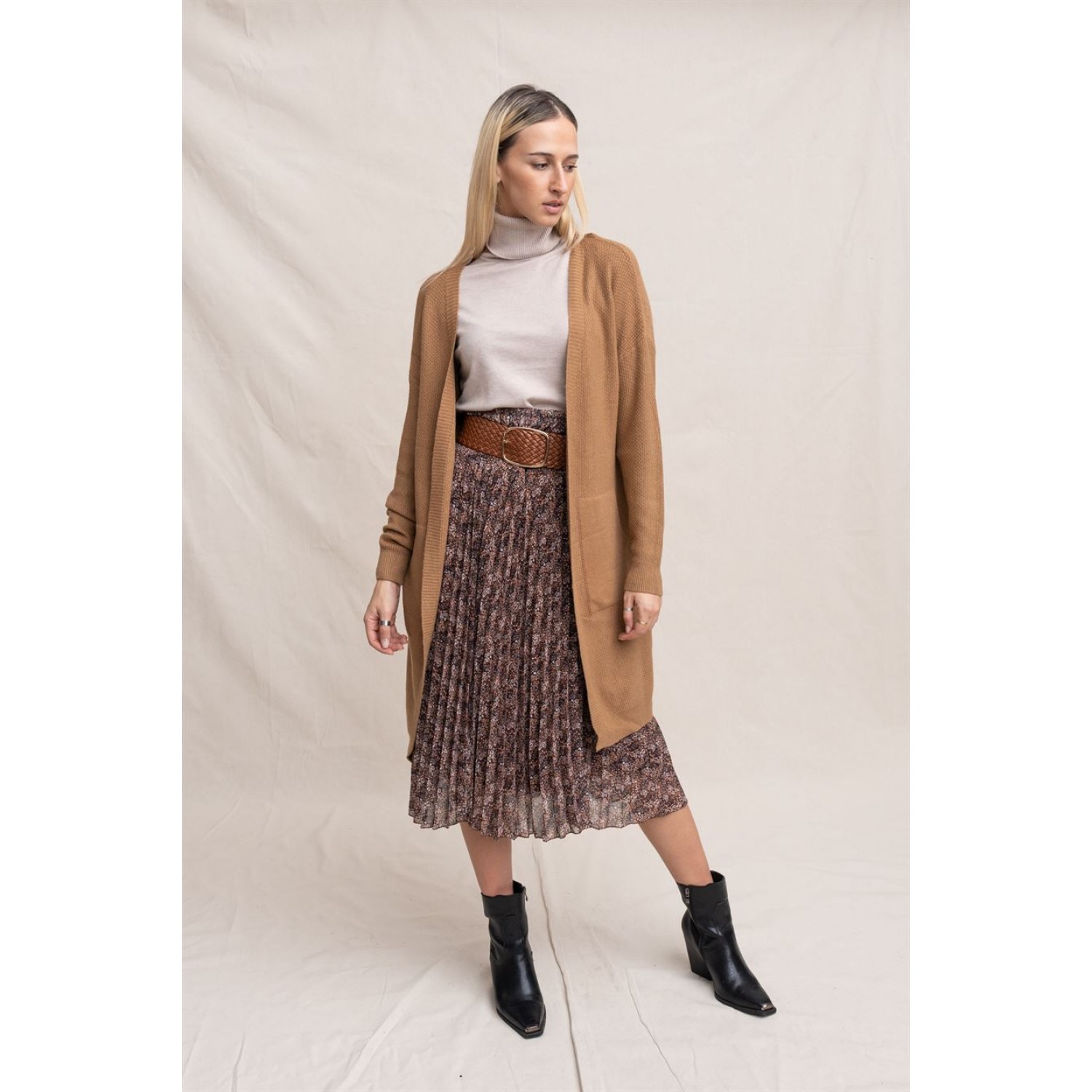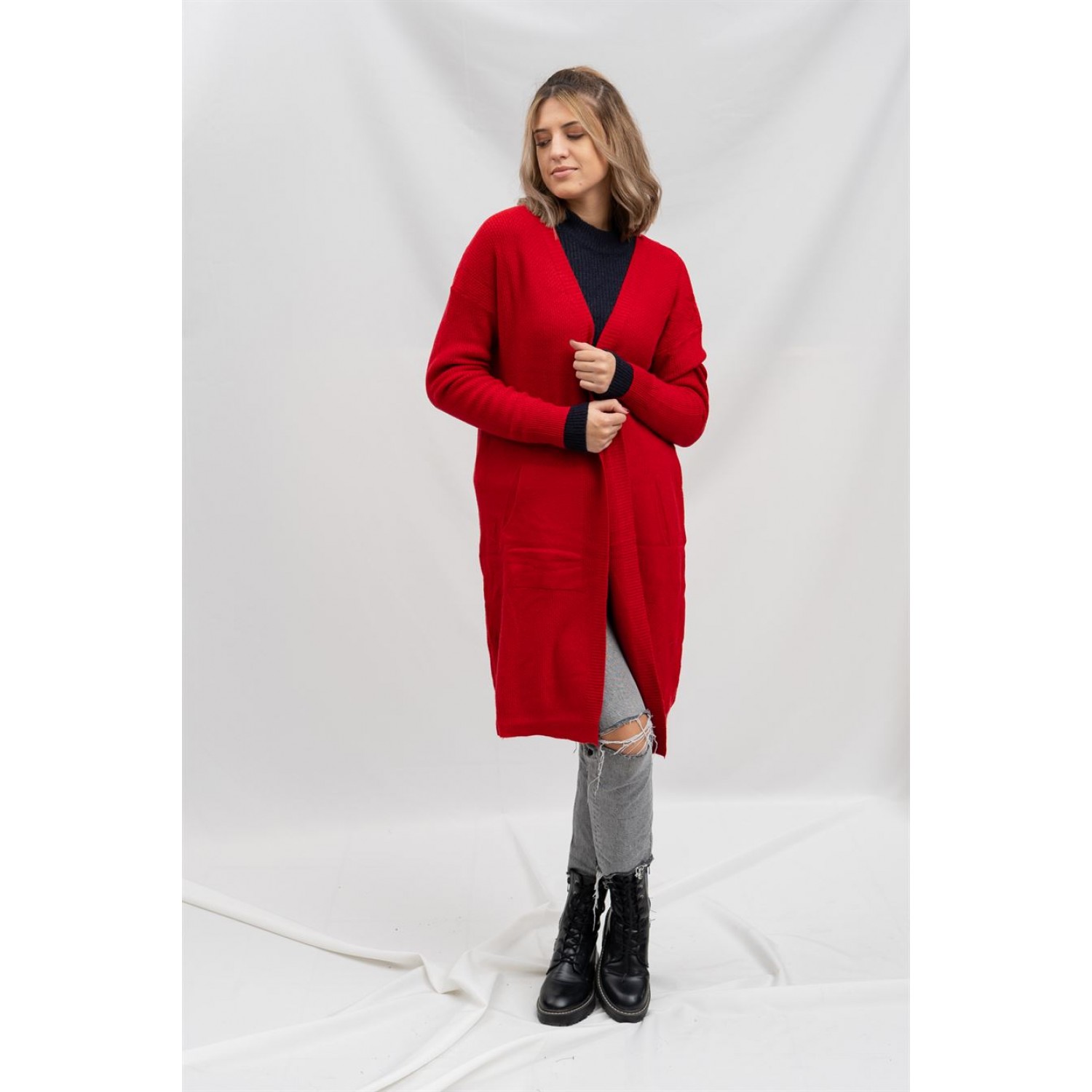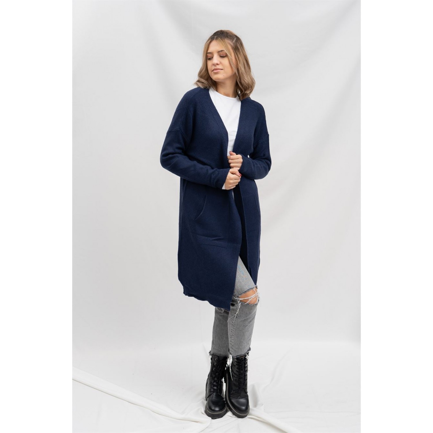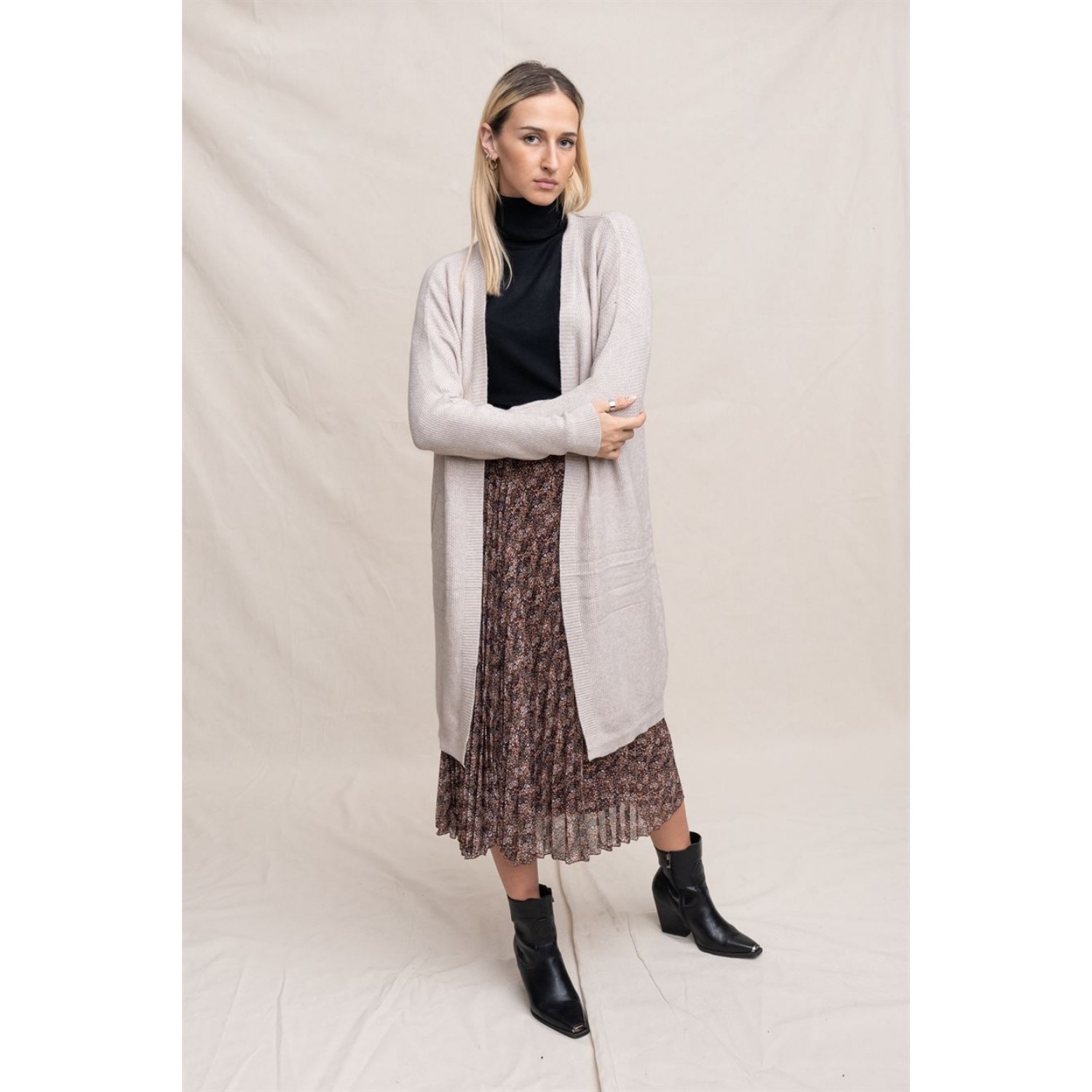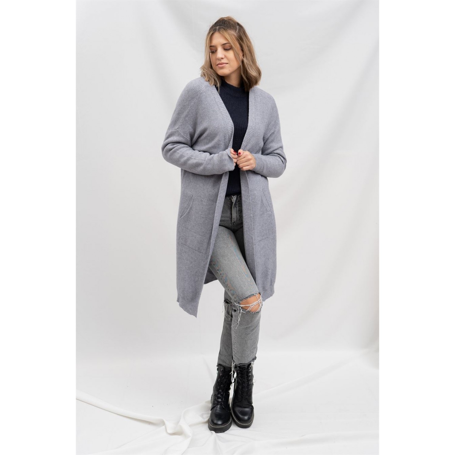 Long cardigan in a comfortable fit. It has two front pockets. A long, comfortable cardigan can ideally complete an outfit with leggings or skinny jeans. Prefer a cardigan that is either quite long or knee-length. Of course you can wear flat shoes, but if you wear a high-heeled bootie, you will make your body look straight and slender.