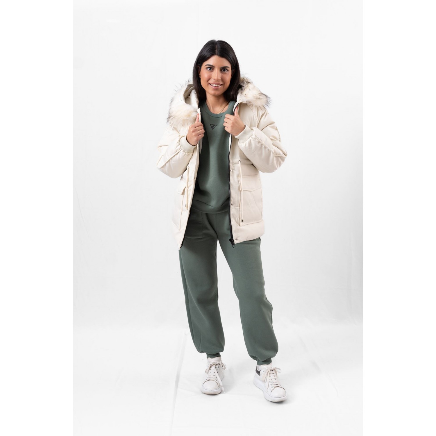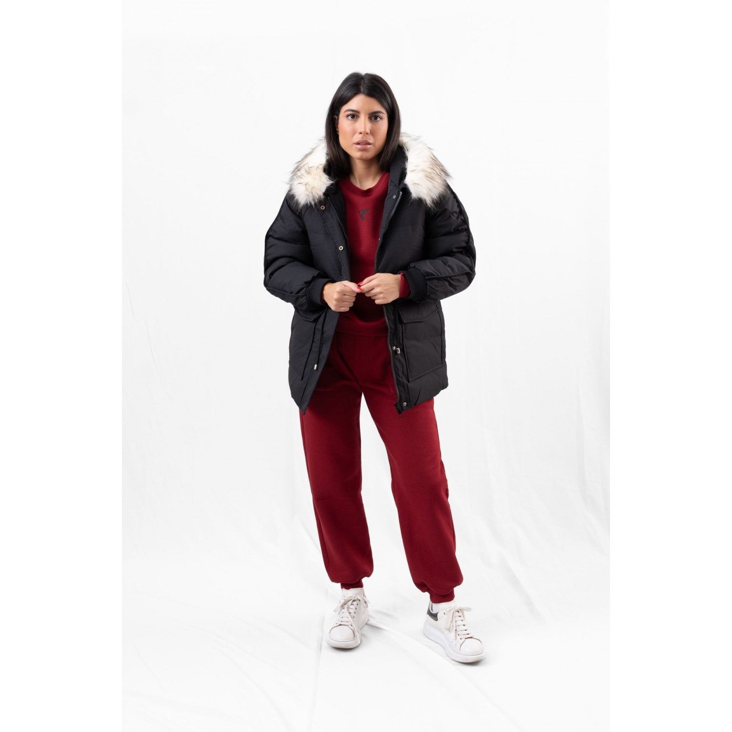 Jacket with detachable hood and front pockets. Zipper closure. Warm, comfortable and extremely versatile, the puffer jacket is one of our favorite winter outerwear – and for good reason. Especially this year, when fashion loves it as much as we do, we have even more reasons to wear it on even more occasions. When you wear such a voluminous coat, it is a good idea to combine it with fitted clothes so that your silhouette looks more harmonious. A pair of leatherette leggings will make your look even more trendy.
