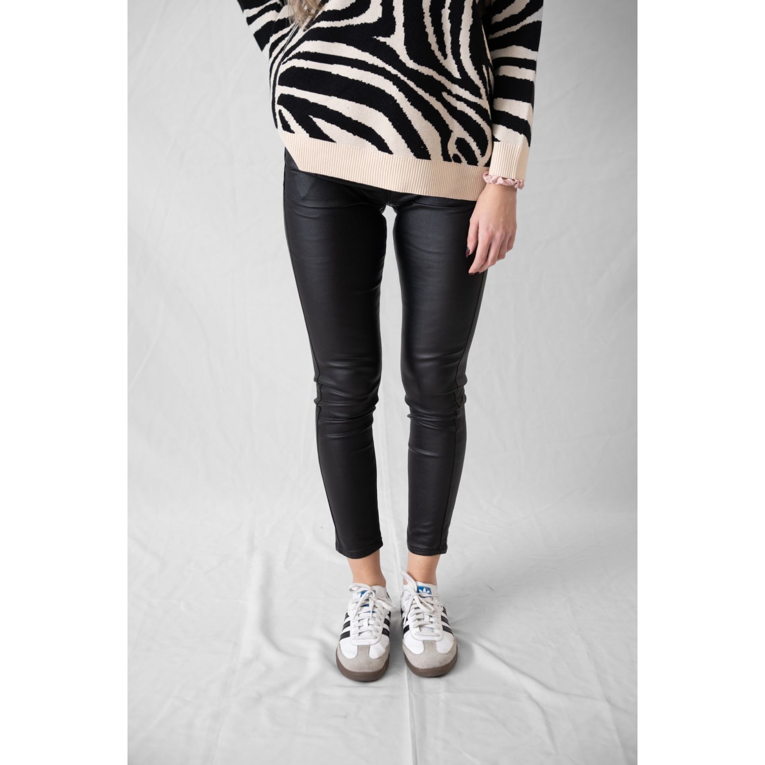 Elastic leatherette pants with front and back pockets. Zipper closure and metal button. T he leather pants are a top fashion trend for the season, but also a timeless piece of women's wardrobe that has been loved a lot. They are suitable for all occasions and can be worn from morning to evening. Of course, you just need to create the right combination of clothes and accessories for the corresponding look. It is the garment that can create a more rock ensemble, but not only that. By wearing it you can compose wonderfully elegant, romantic and extremely feminine looks that will make you steal the show.