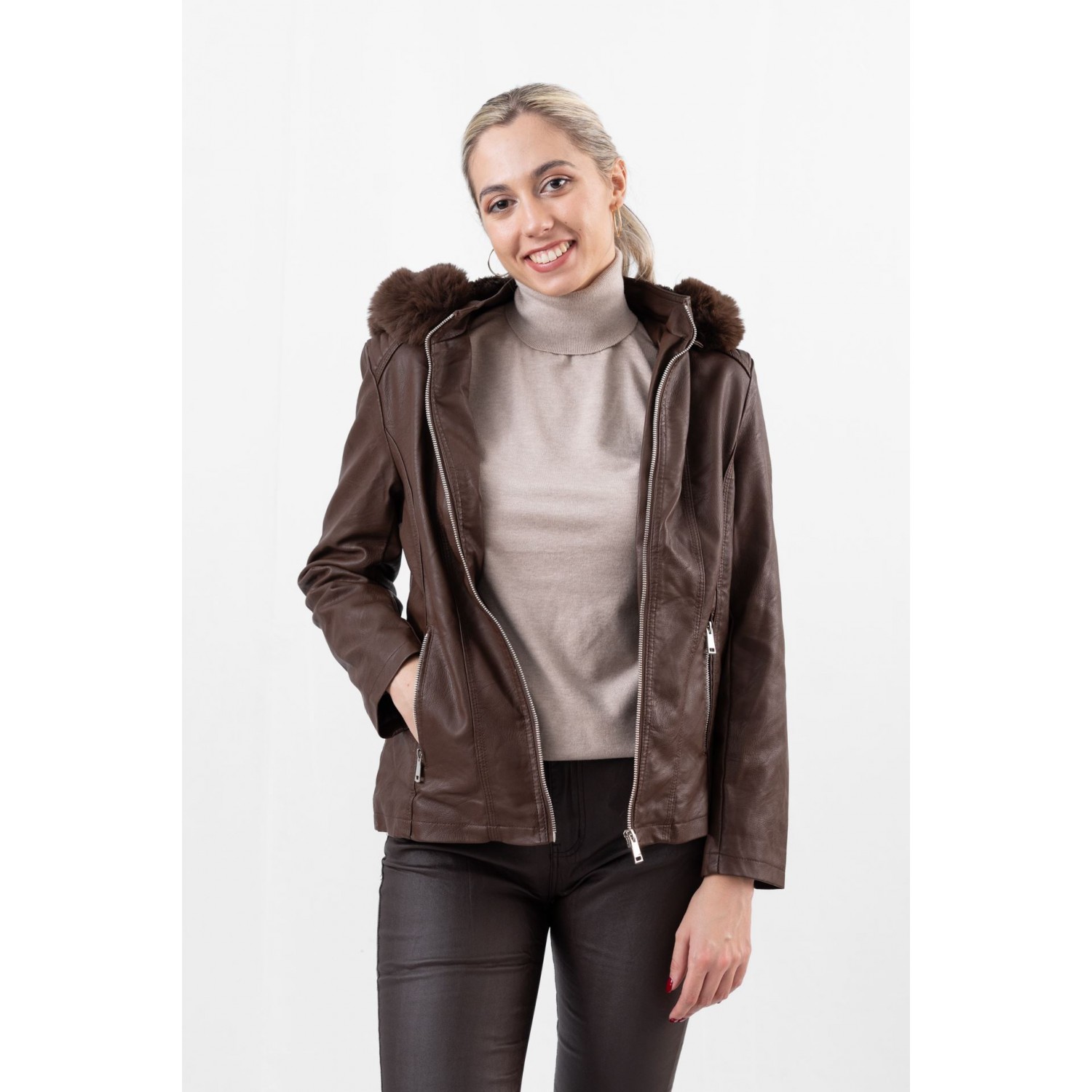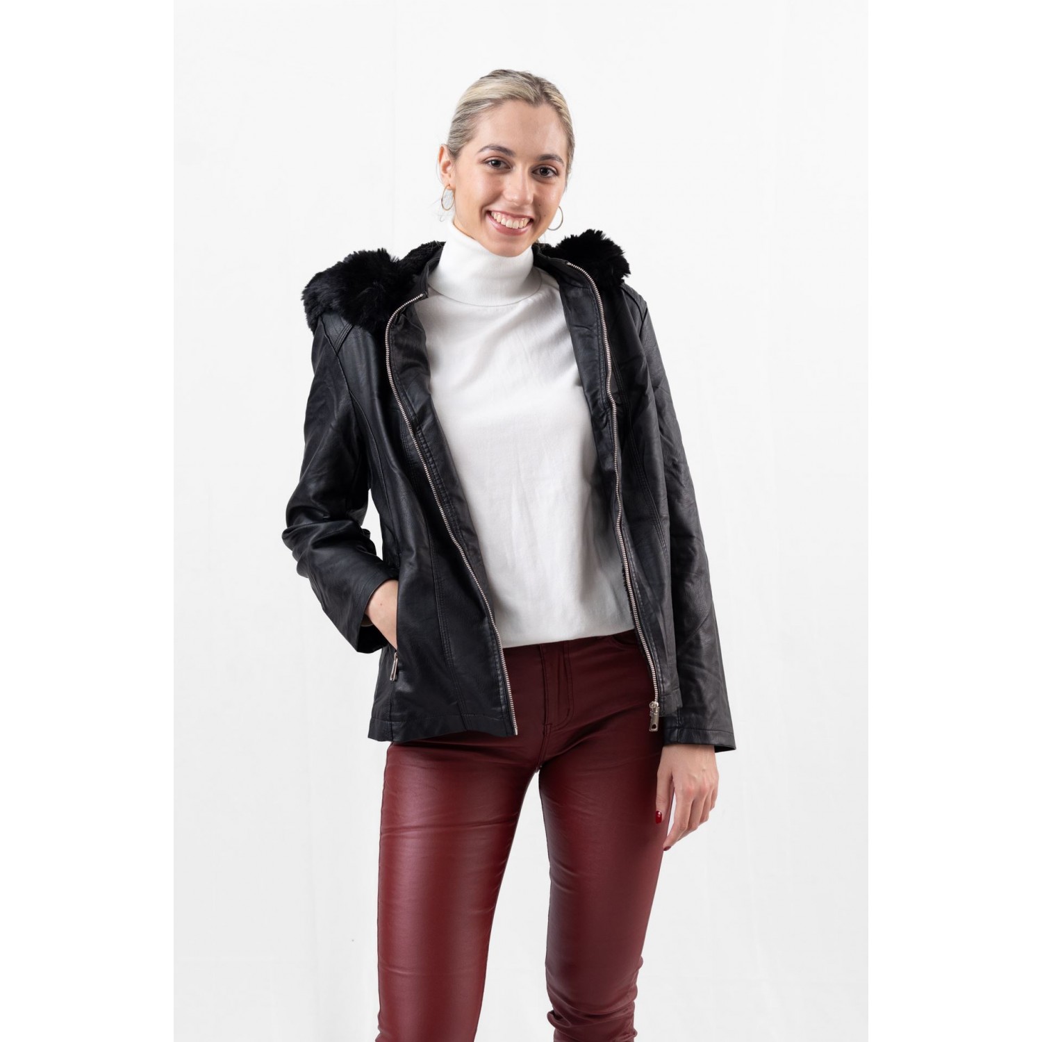 Leatherette jacket with detachable hood and inner fur. It has side pockets. Zipper closure. Timeless and easy to combine, the leather jacket is one of the most essential outerwear for a woman. It is warm and adds style to every outfit! It can be worn from the morning walk or the office to our evening outings, completing any ensemble with great success. A biker jacket goes with any type of pants. So dare to create beautiful casual sports outfits with leggings or sweatpants, combining them with a simple t-shirt and your sneakers. If you prefer the most seductive looks, you can wear high-heeled shoes instead of sneakers. The result is extremely impressive and very stylish. For your most casual looks, you can wear a classic fabric colored or black pants with a shirt and a sweater. However, if your style is more youthful and geeky, dare to wear an outfit with wide pants and a t-shirt combined with sneakers and complete the look with a leather motorcycle jacket.
