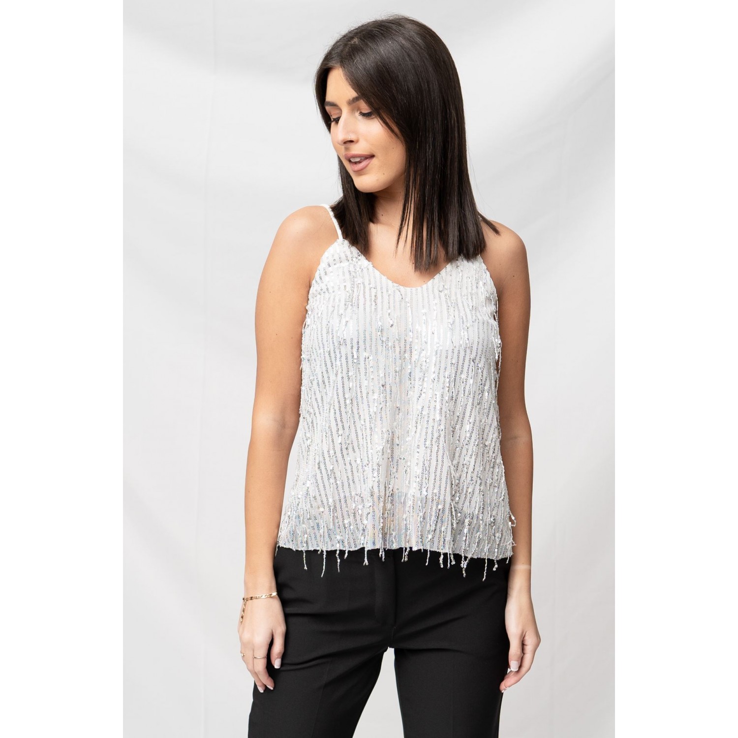 Sequin top with straps . Sequin blouses or tops are also a great idea for glamorous looks. Combine it with pants, skirts or shorts that are not shiny or metallic and create impressive outfits for any time and moment. A sequin blouse or top goes great with jeans, whether skinny or boyfriend. Try it and create impressive casual chic outfits for the office, but also for your walks. In fact, if you wear a mid-length jacket on top, then you will definitely steal the show with the elegance of your outfit. For your evening and formal looks, however, combine a shiny top or a blouse that has sequins with a skirt in any line or length you wish. Pencil skirts are particularly beautiful and seductive. Equally impressive are tulle, pleated satin or skater skirts. In addition to the skirt, you can also choose skinny or wide-leg pants and create stunning evening ensembles.