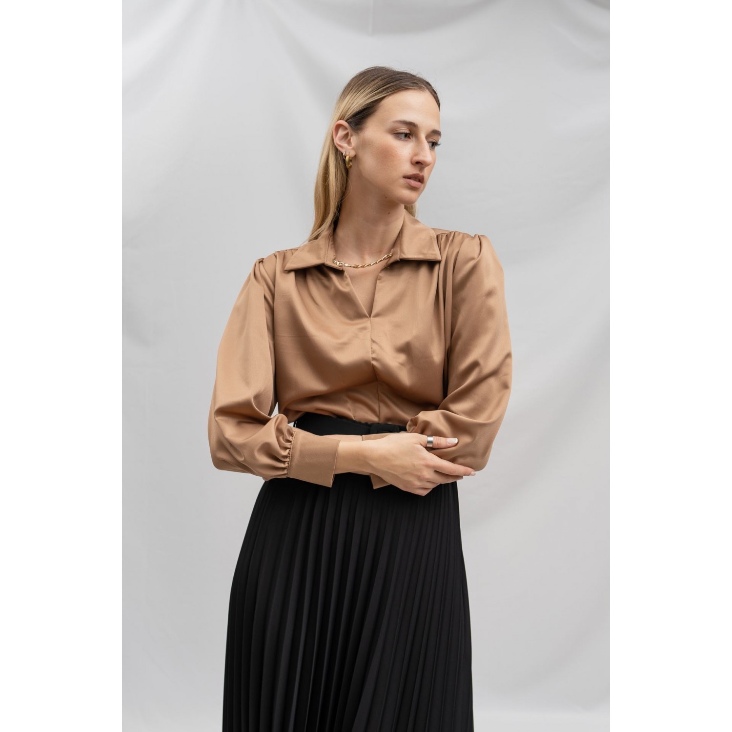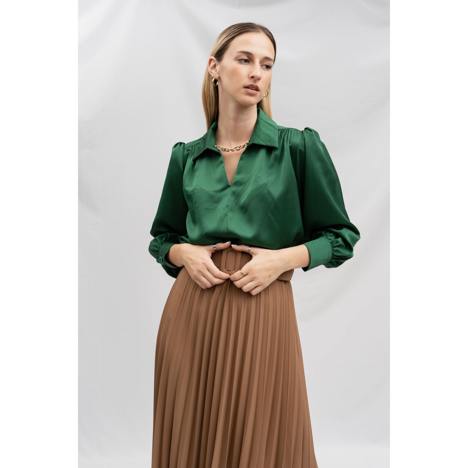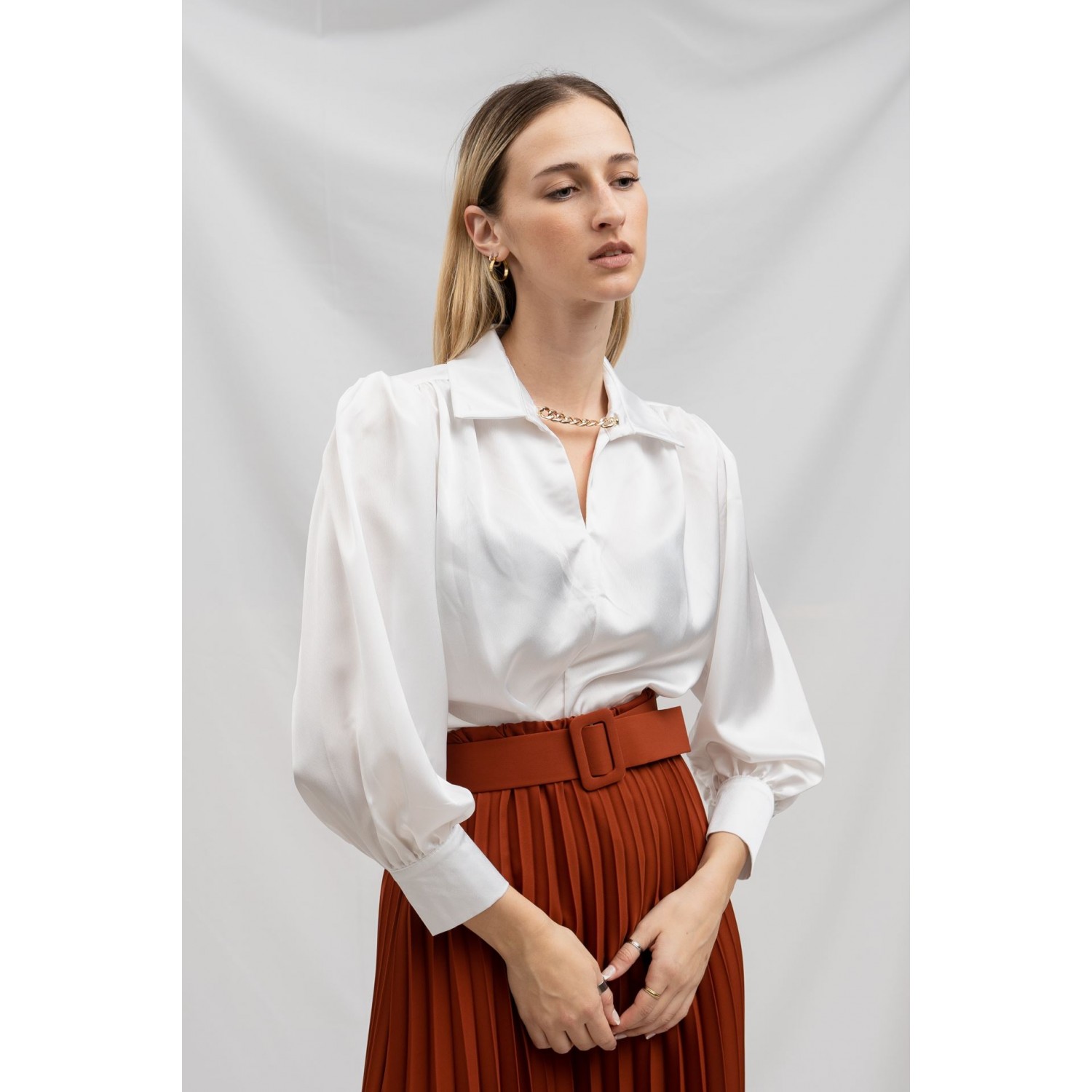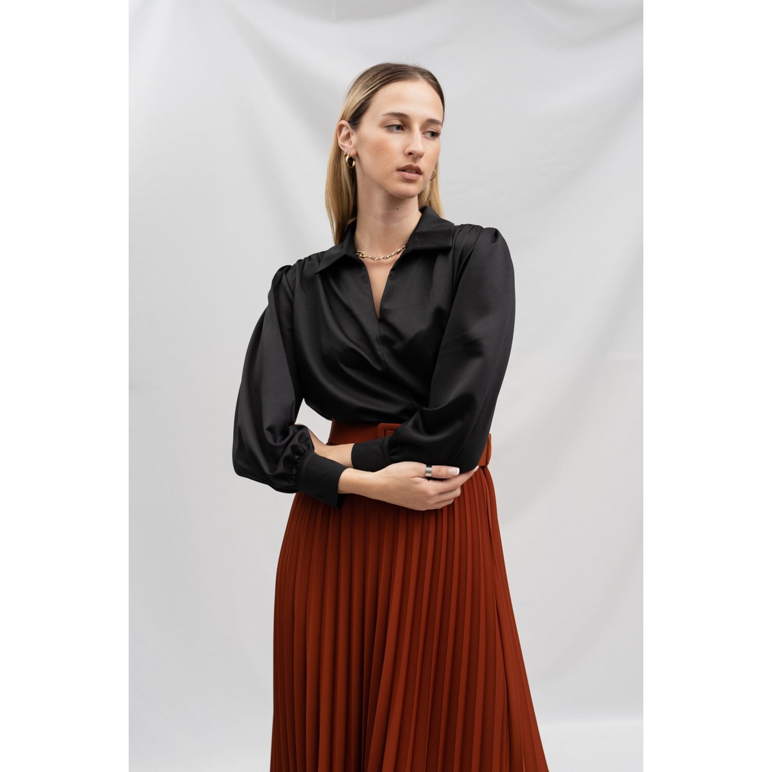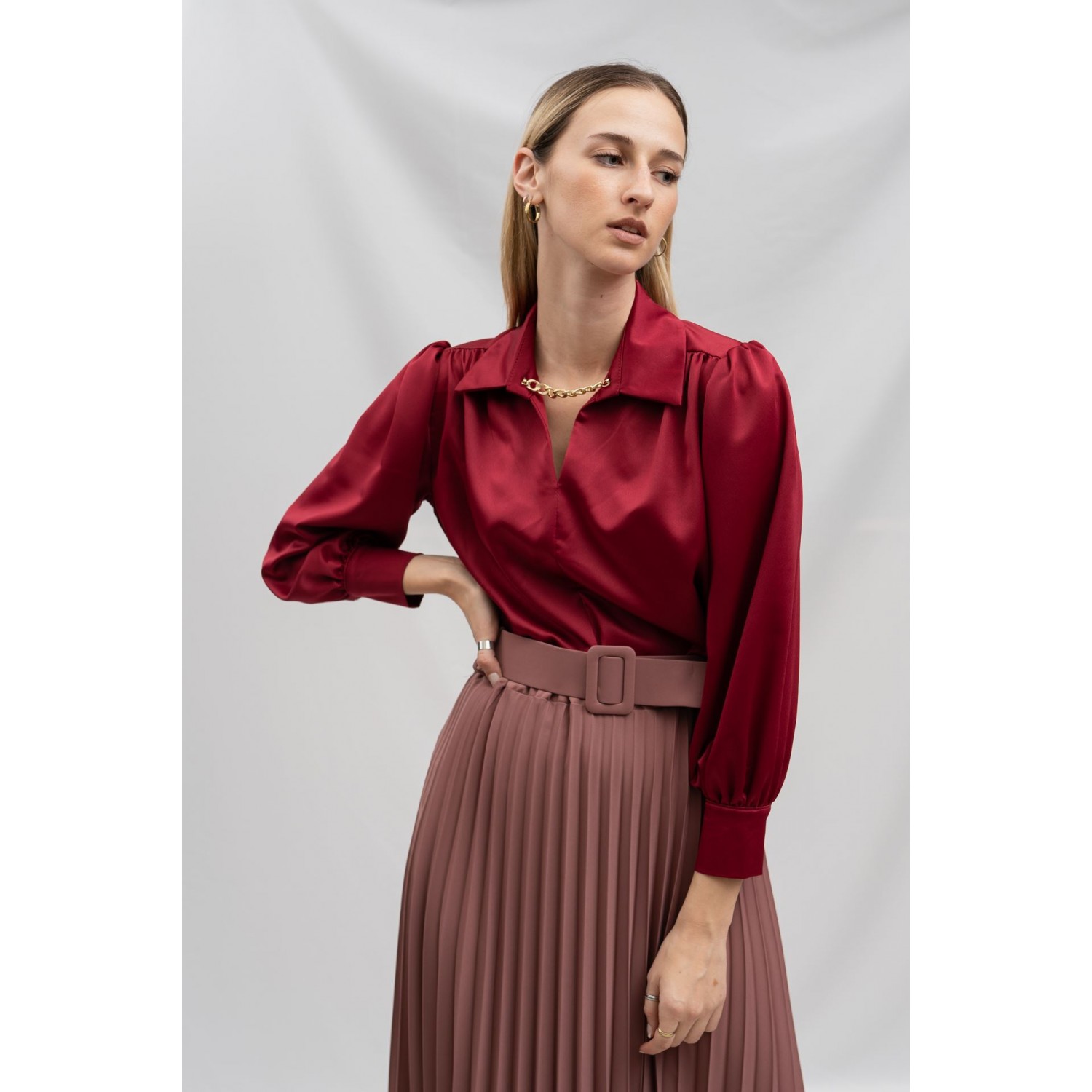 Blouse with collar and V neckline. It has a detachable chain. It has buttons on the sleeves. The satin shirt is one of the most delicate pieces that a woman has in her wardrobe. Elegant and refined, it can be worn to the office with a pair of fabric trousers, while it can dress up a pair of jeans. It is also ideal for an evening out, with a chic midi skirt and a jacket or trench coat.