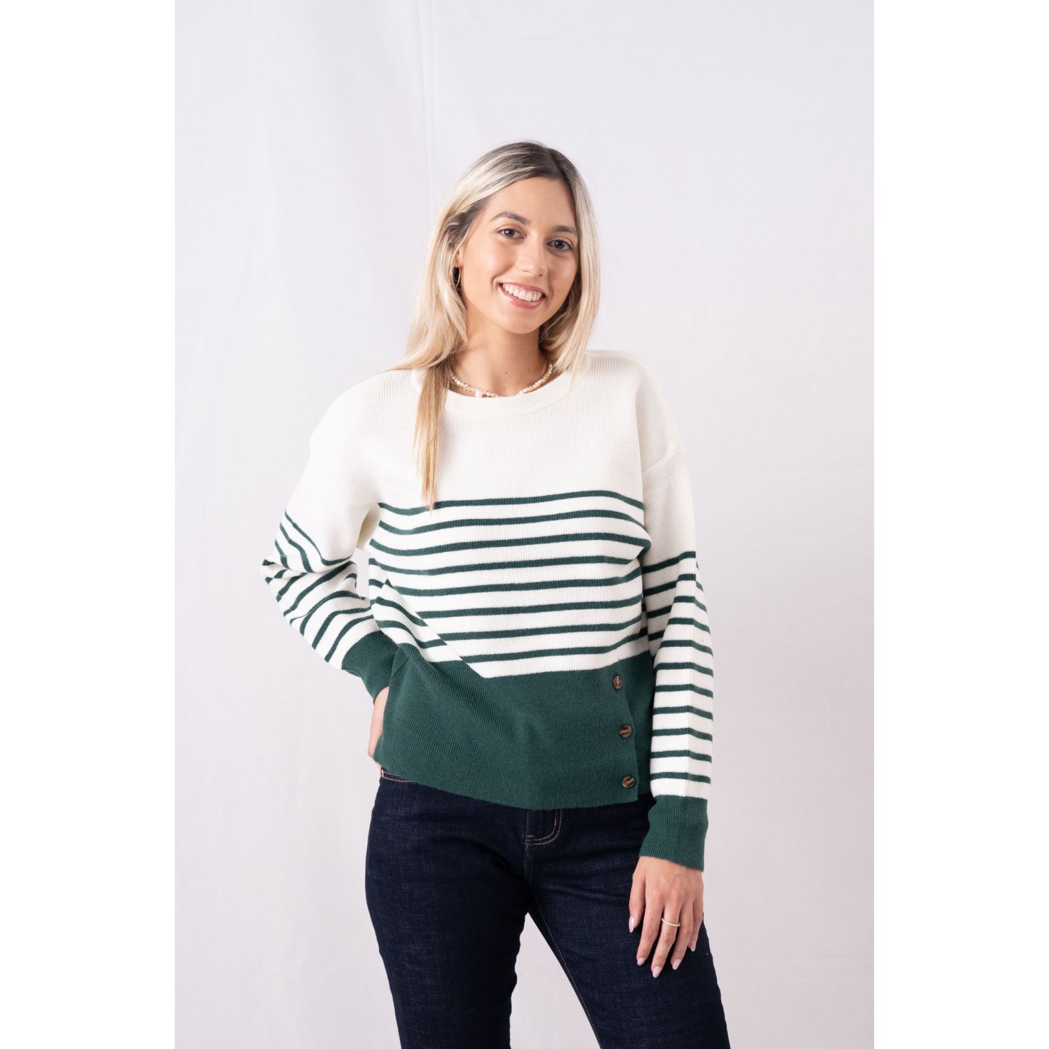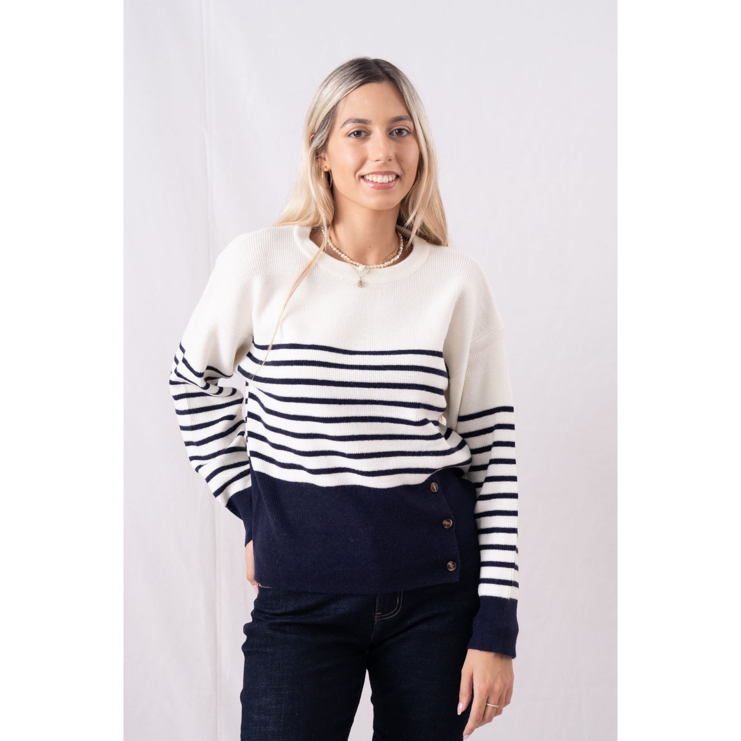 Πουλόβερ ριγέ με λαιμόκοψη και διακοσμητικά κουμπιά στο κάτω μέρος. Η μπλούζα με ρίγες ή αλλιώς μαρινιέρα, είναι ένα κλασικό και διαχρονικό ρούχο που έχει πλέον κάθε γυναίκα στη ντουλάπα της. Τη λατρεύουμε γιατί μπορεί να φορεθεί σε πολλές περιστάσεις από το πρωί μέχρι το βράδυ και από όλες τις ηλικίες ενώ ανάλογα με τη διάθεση και το γούστο, μία μπλούζα με ρίγες μπορεί να φορεθεί με sporty αισθητική ή ακόμη και σε ένα business look στο γραφείο!