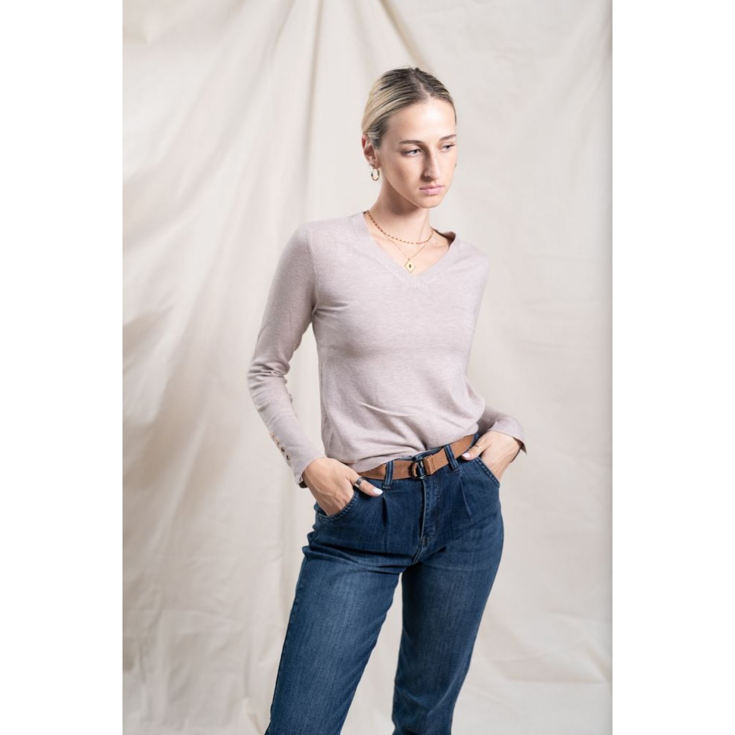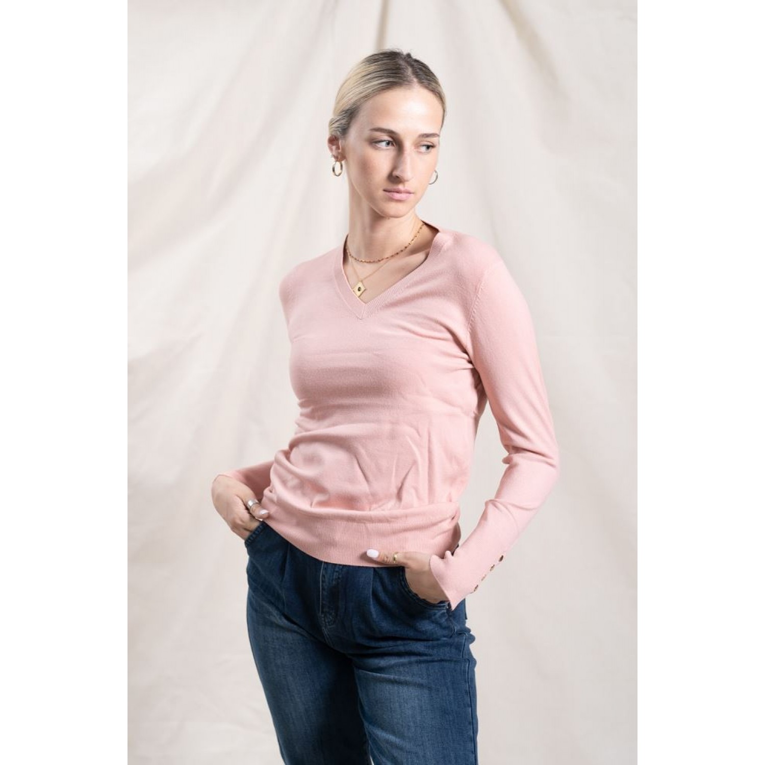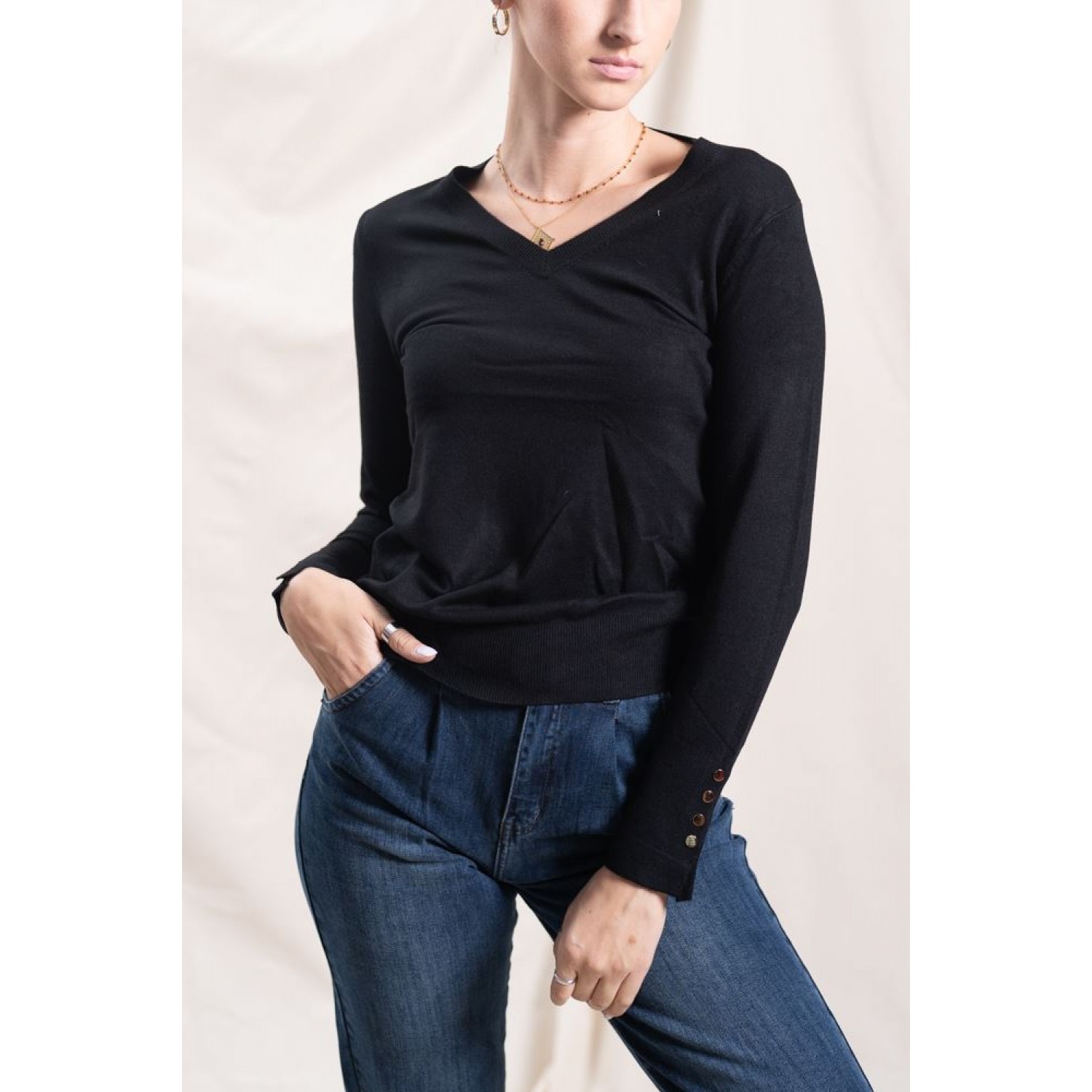 Stretchy sweater with a V-neckline and gold button details on the sleeves. You can wear it with your favorite denim and make great spring combinations.