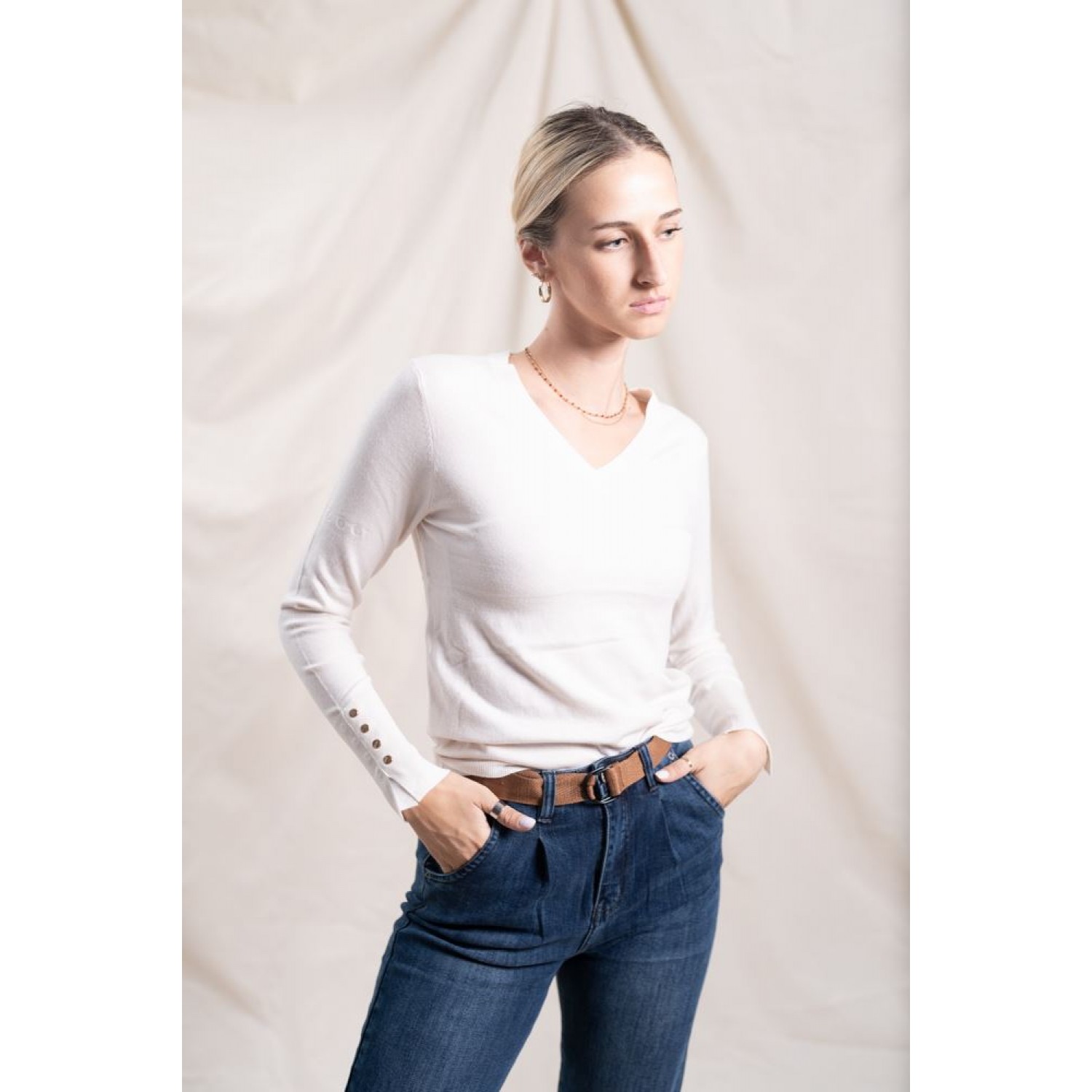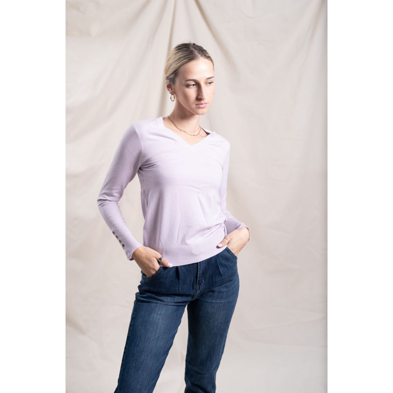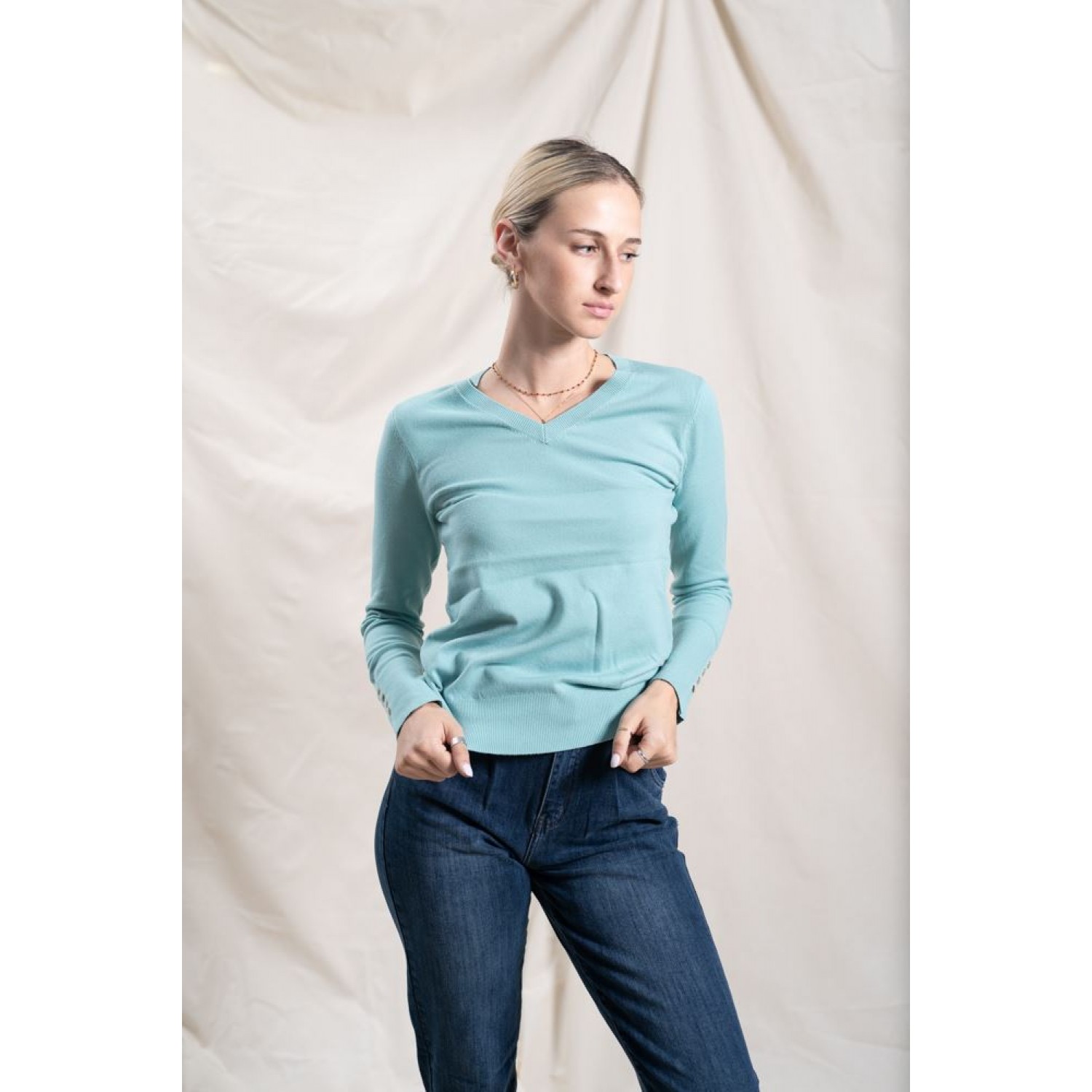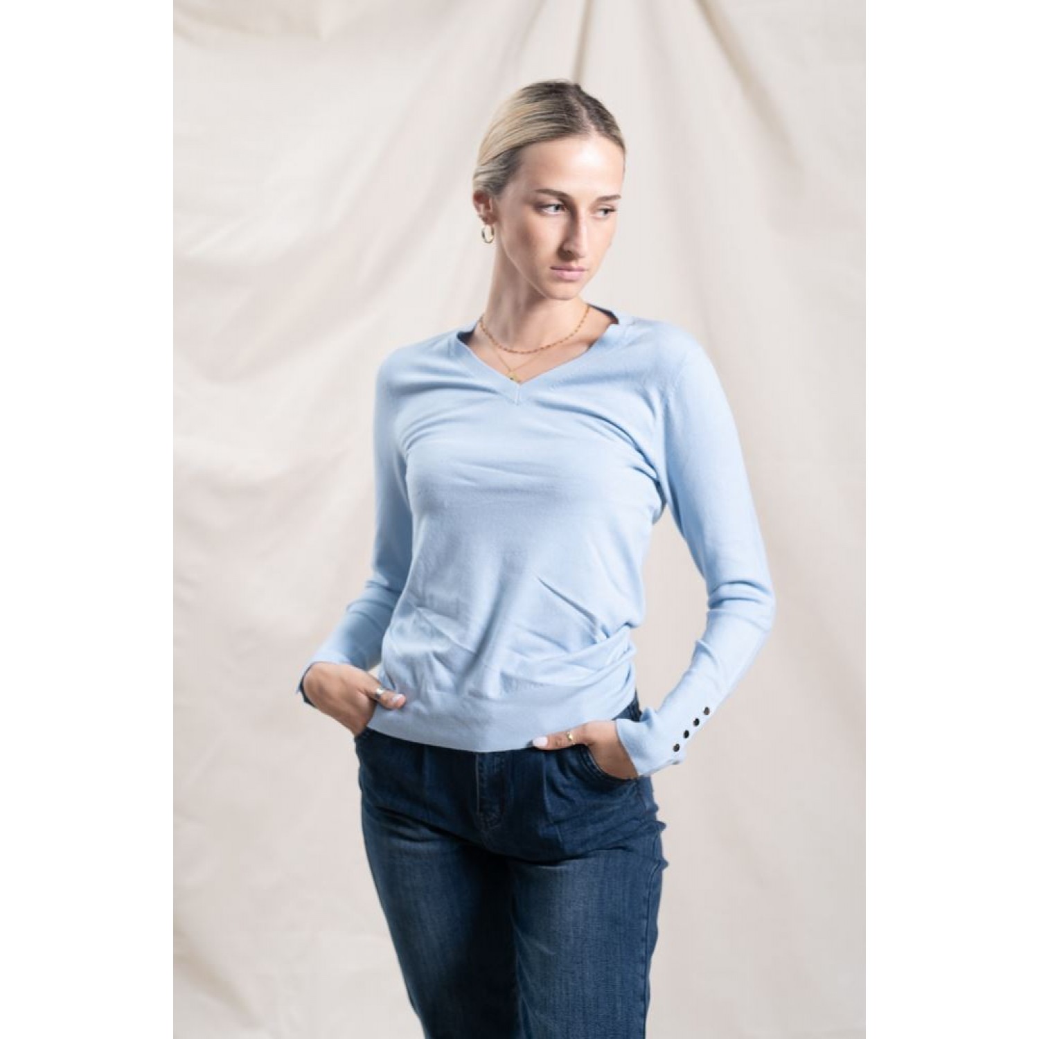 Stretchy sweater with a V-neckline and gold button details on the sleeves. You can wear it with your favorite denim and make great spring combinations.