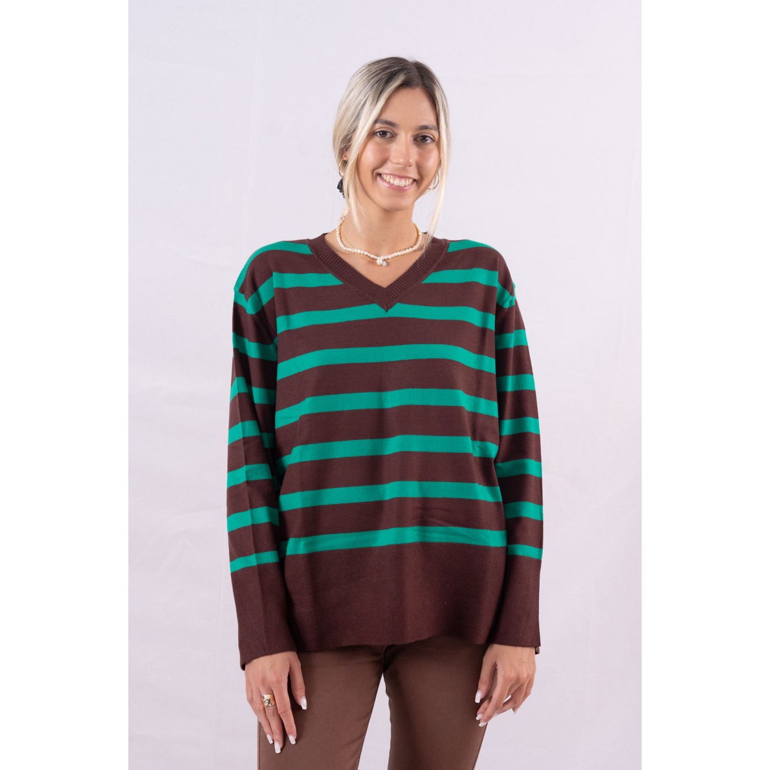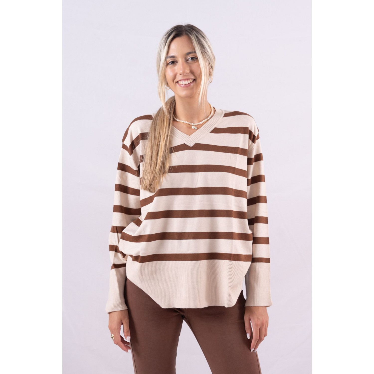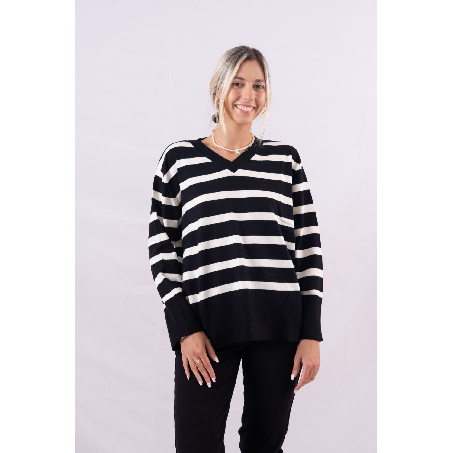 Striped sweater with V-neck. Among white shirts, cable knit sweaters, trench coats and denim skirts, the striped sweater is also on the list . This absolutely timeless knitted garment that is as elegant as a delicate designer dress. I think it is this particular pattern that makes the striped sweater so irresistible. It has the perfect balance of coolness, preppy fashion and of course timelessness. Everything "marries" with each other so uniquely and the result is this classic wardrobe piece. It is a "chameleon" garment. One can wear it and compose a simple and easy-going ensemble, while there is also a more fashionable side to it. Since the striped sweater has gained the interest of many fashionistas in recent months, we are reminded of its effortlessly chic mood. The striped sweater, therefore, is worn by many fashion lovers. Whether choosing a thin striped design, one in off-white and black, or one that's thicker and suitable for winter, the striped sweater steals the show.