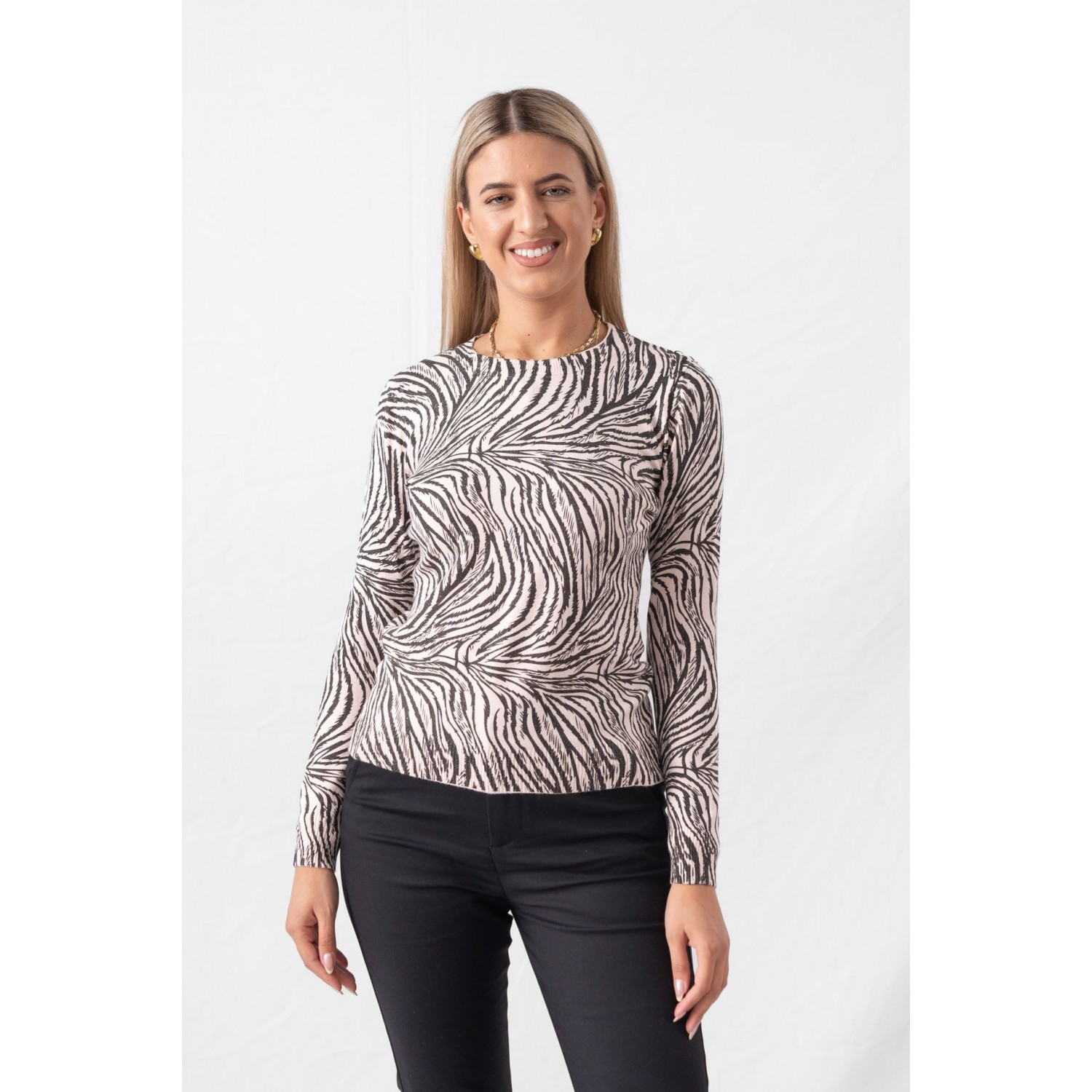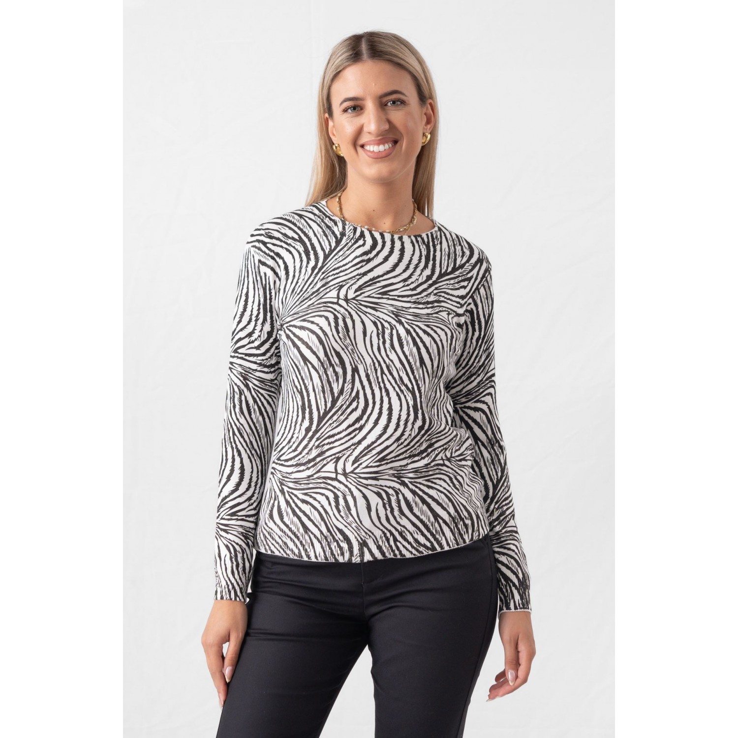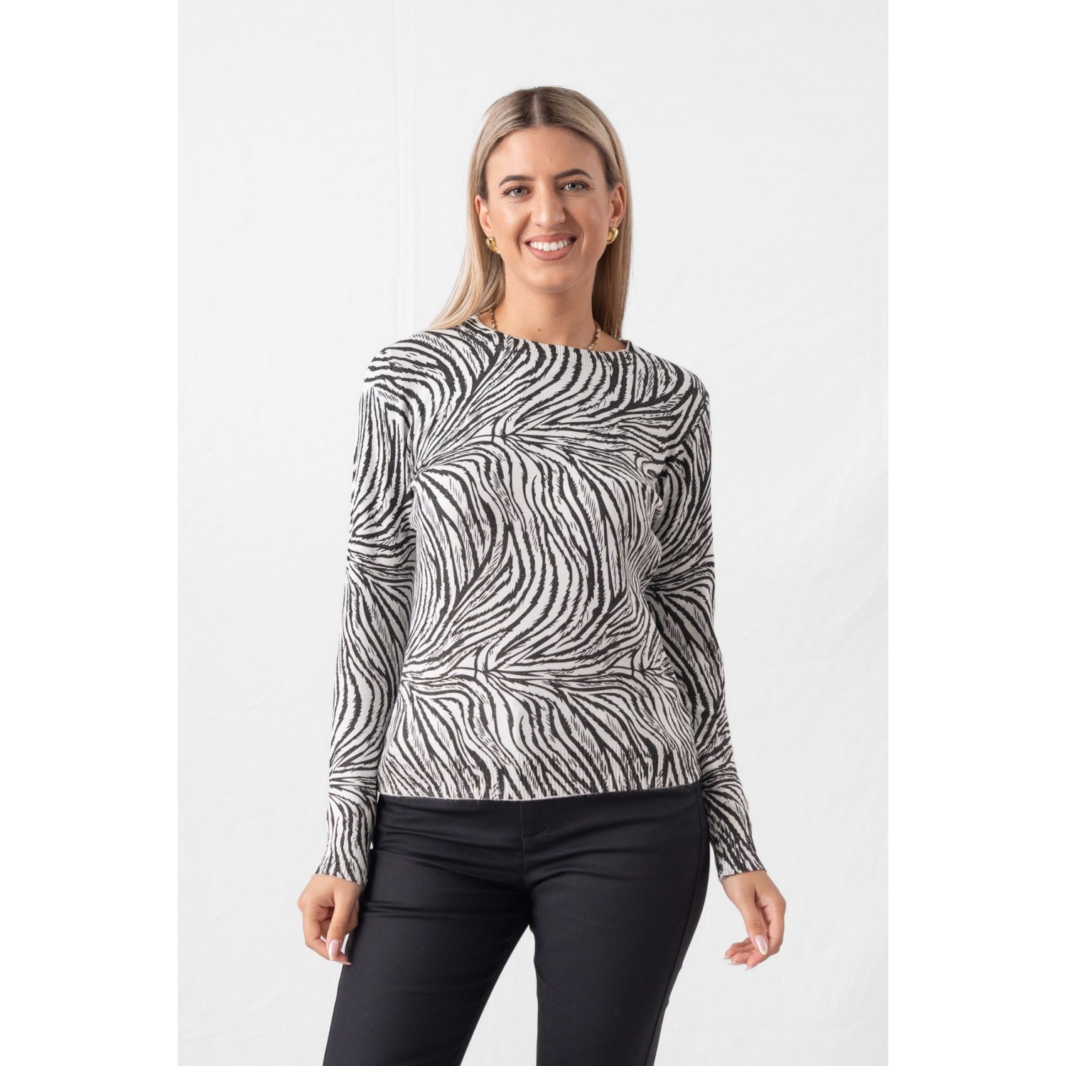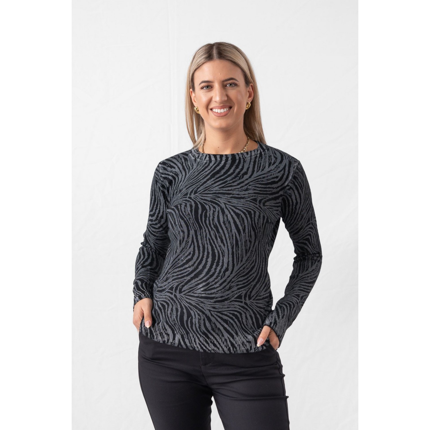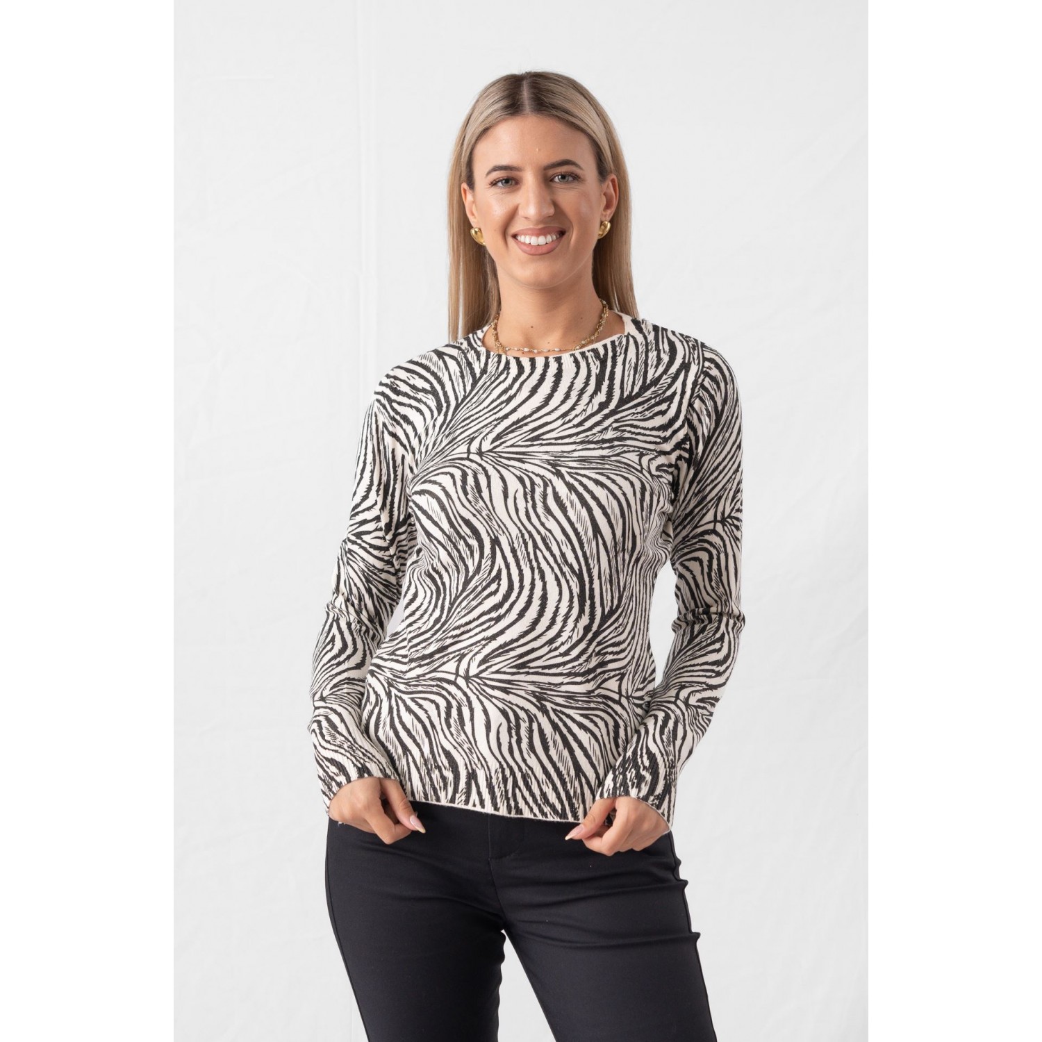 Zebra sweater with a crew neck and gold thread. Many of you think that these patterns are only for evening outings. Think again, though, as you can also add them to your casual looks, such as your walk to the market, coffee with a friend or the cinema in the afternoon. In fact, according to fashion girls, the way to go is by choosing a sweater - after all, there is no winter without cozy jumpers. You can choose between the most delicate turtlenecks and the most cozy and chunky ones and combine them with your favorite jeans, leggings or a leather item. Keep the rest of the outfit simple, do not exceed the golden rule of three colors and stay away from anything flashy.