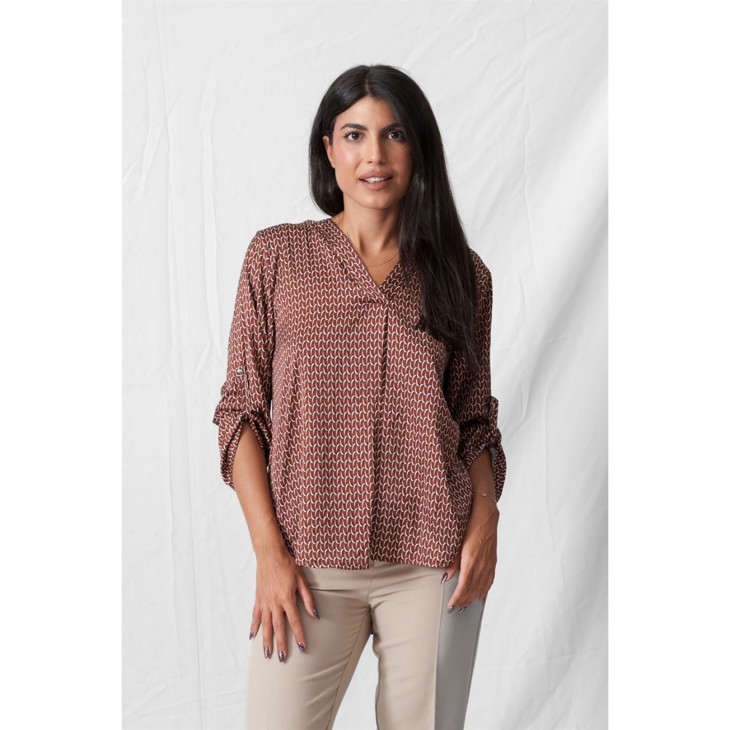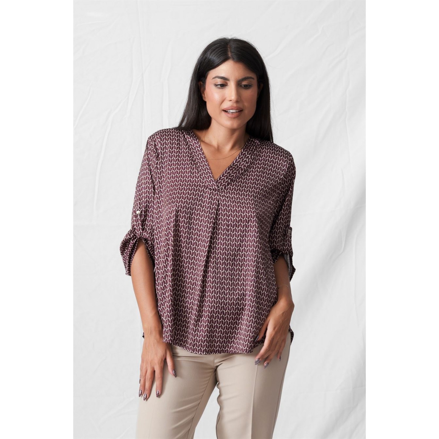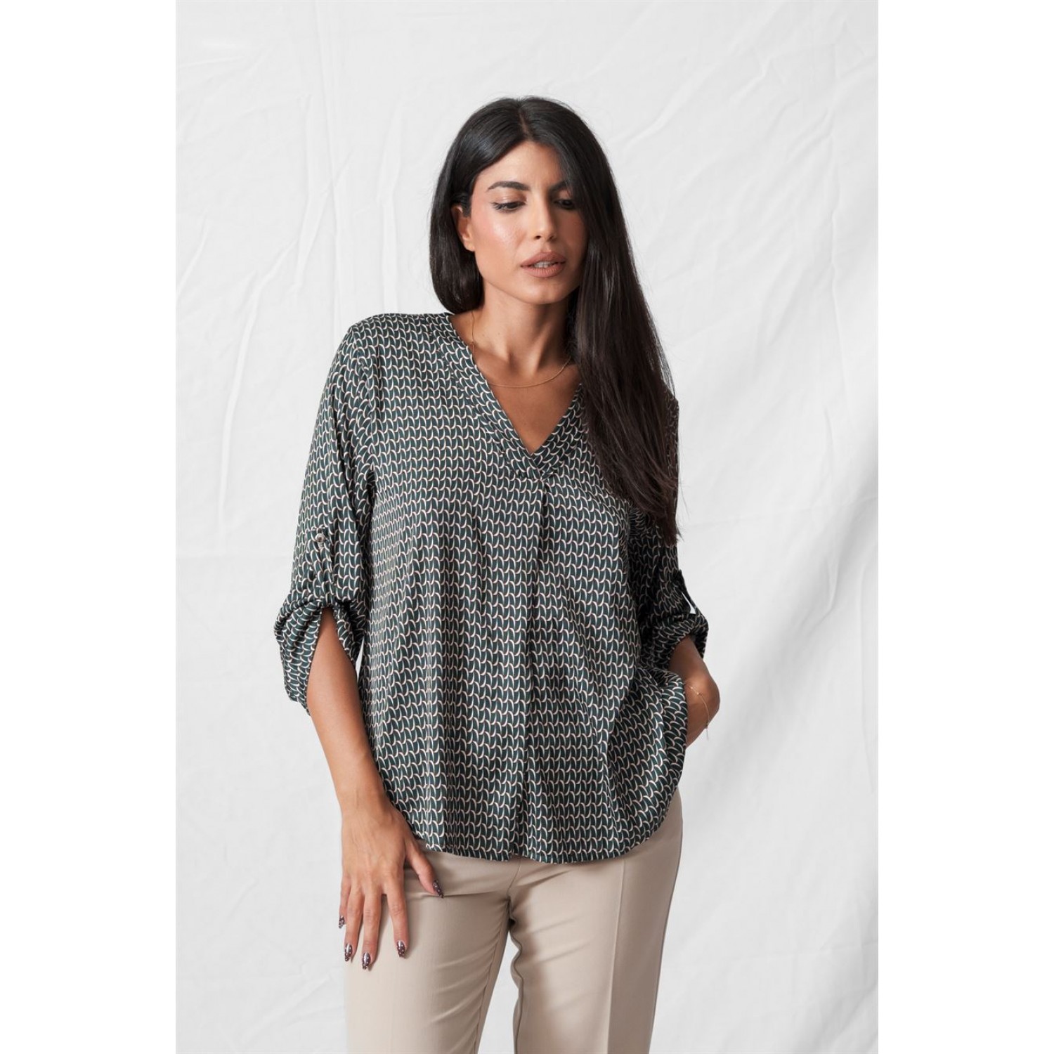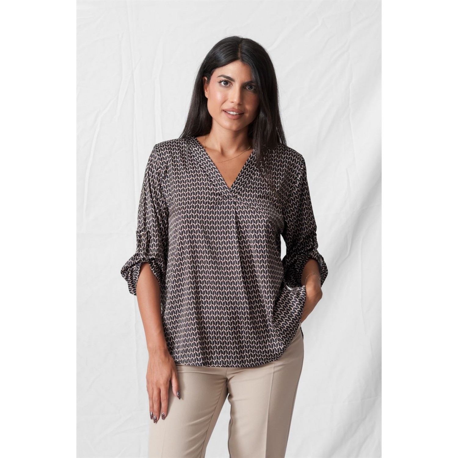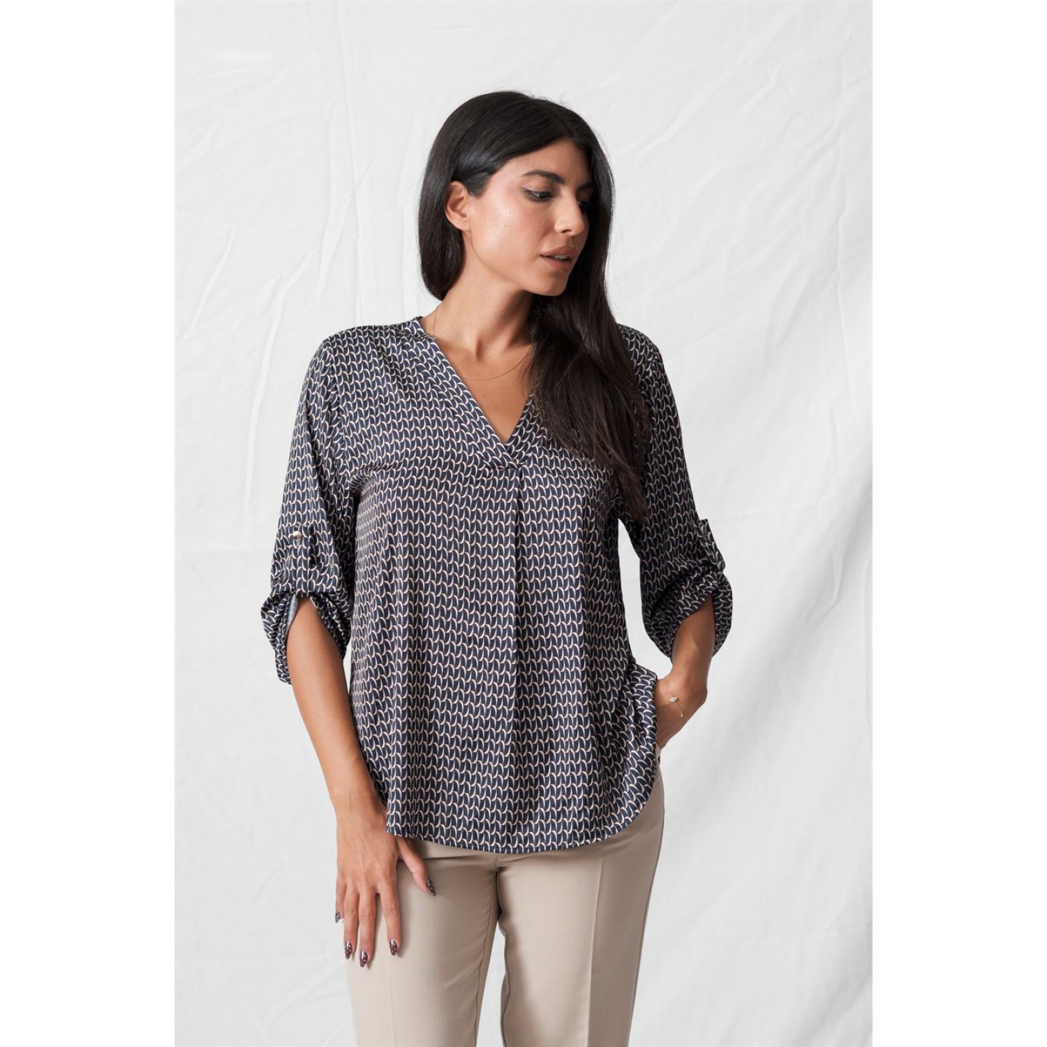 Πουκαμίσα σατέν εμπριμέ με V ντεκολτέ. Το σατέν πουκάμισο είναι ένα από τα πιο ντελικάτα κομμάτια που μια γυναίκα έχει στην γκαρνταρόμπα της. Κομψό και φίνο, φοριέται στο γραφείο με ένα υφασμάτινο παντελόνι, ενώ μπορεί να κάνει dress up ένα τζιν. Είναι επίσης ιδανικό για μια βραδινή έξοδο, με μια σικάτη μίντι φούστα και ένα σακάκι ή καμπαρντίνα.