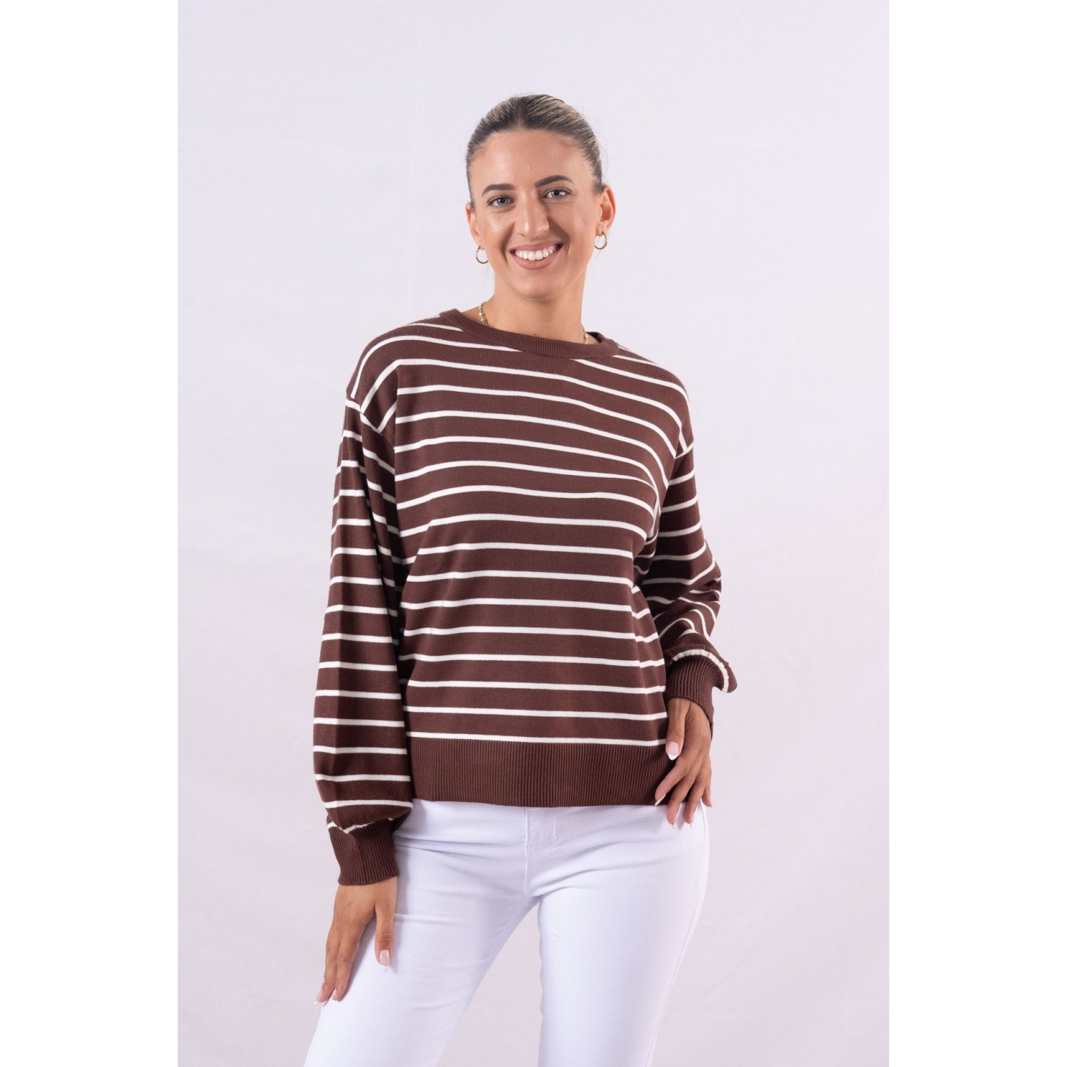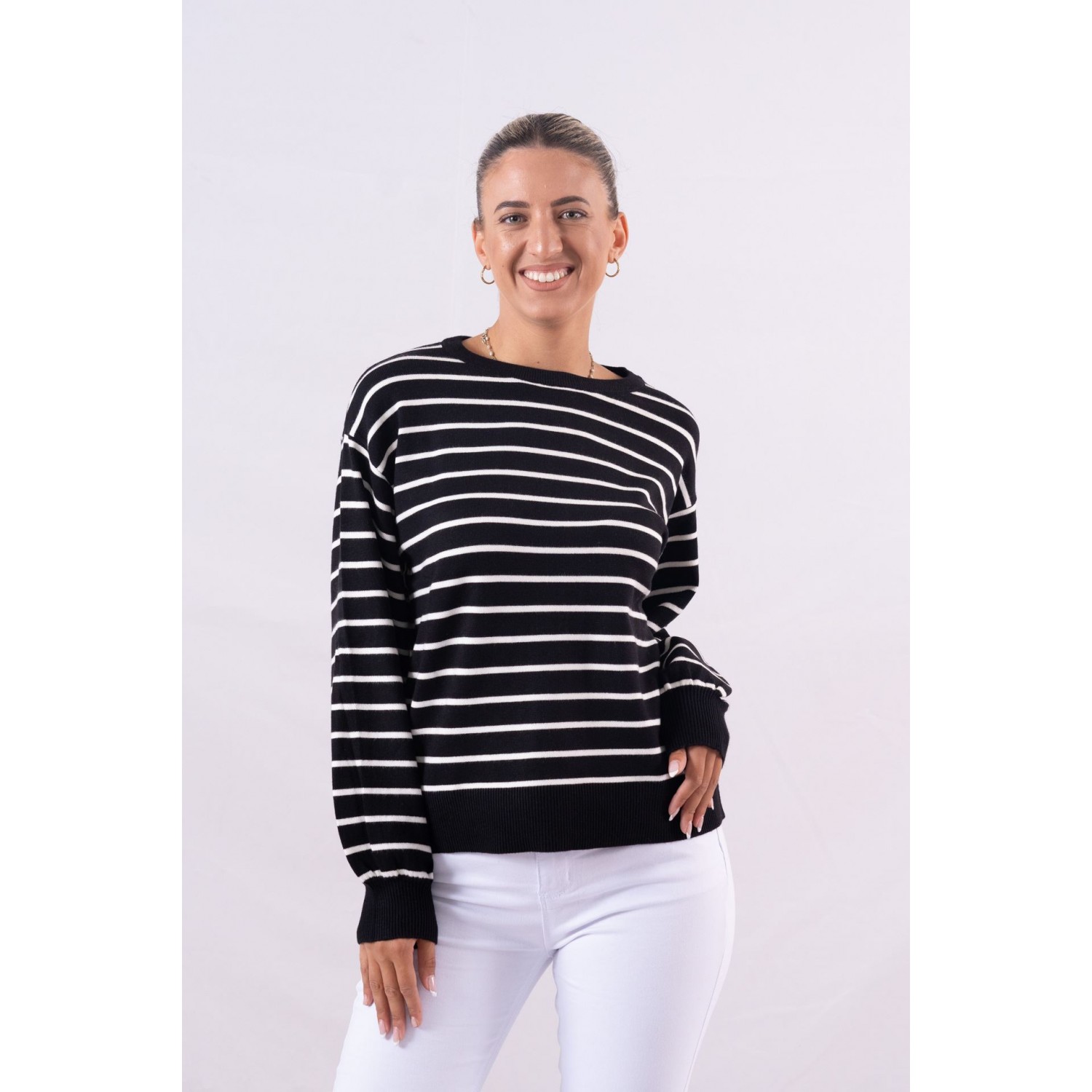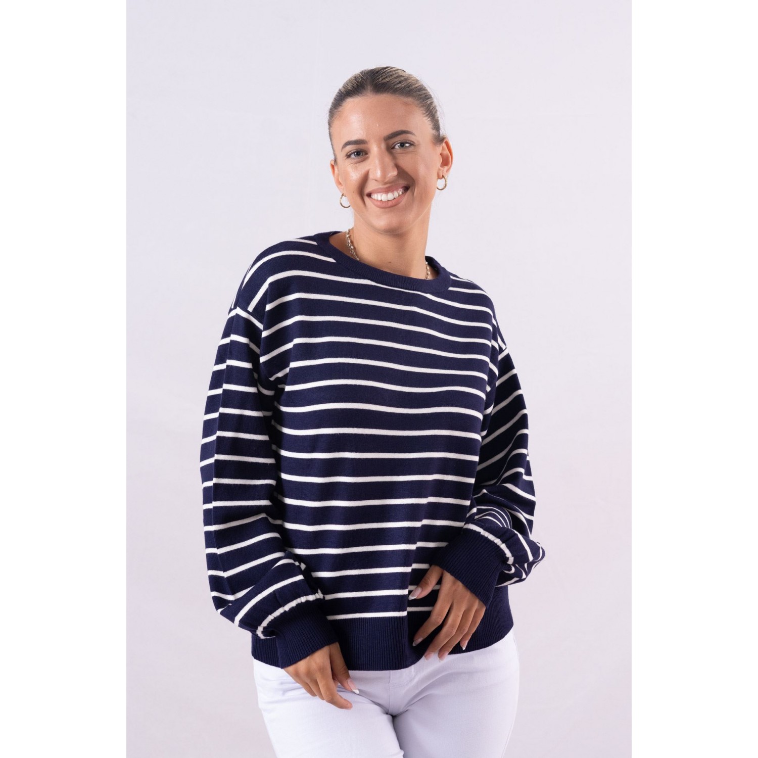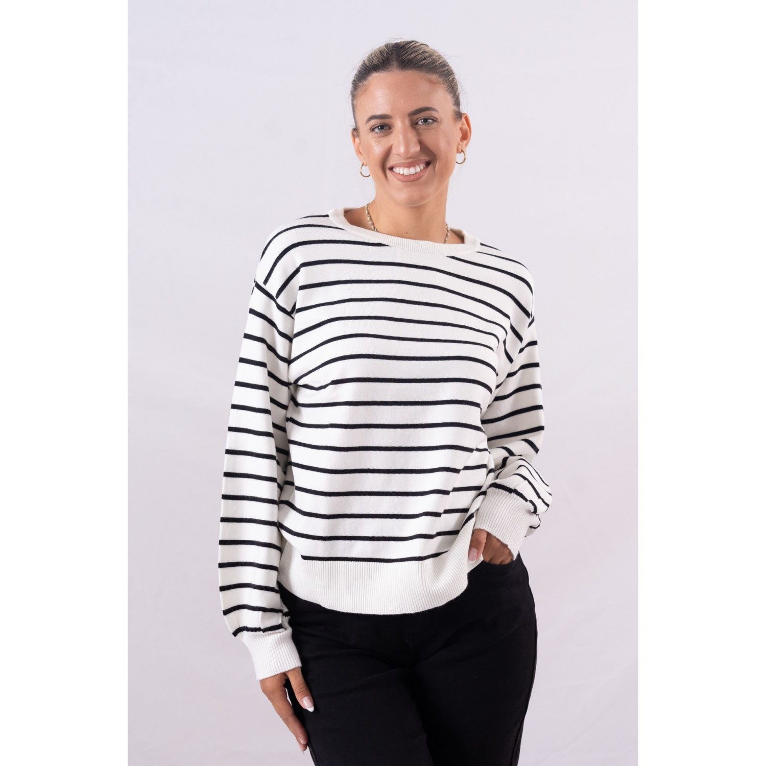 Πουλόβερ ριγέ με λαιμόκοψη και διακοσμητικά κουμπιά στα μανίκια. Η μπλούζα με ρίγες ή αλλιώς μαρινιέρα, είναι ένα κλασικό και διαχρονικό ρού..