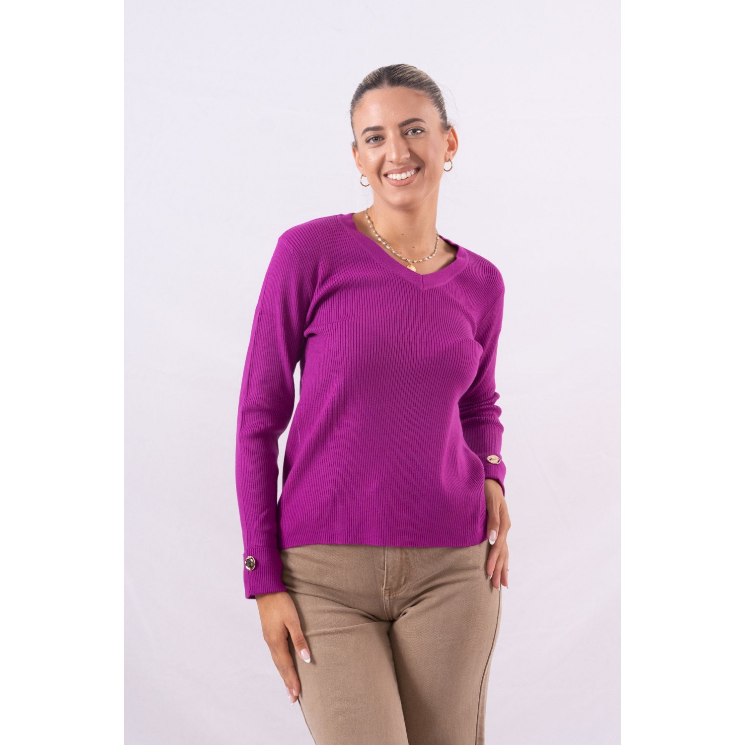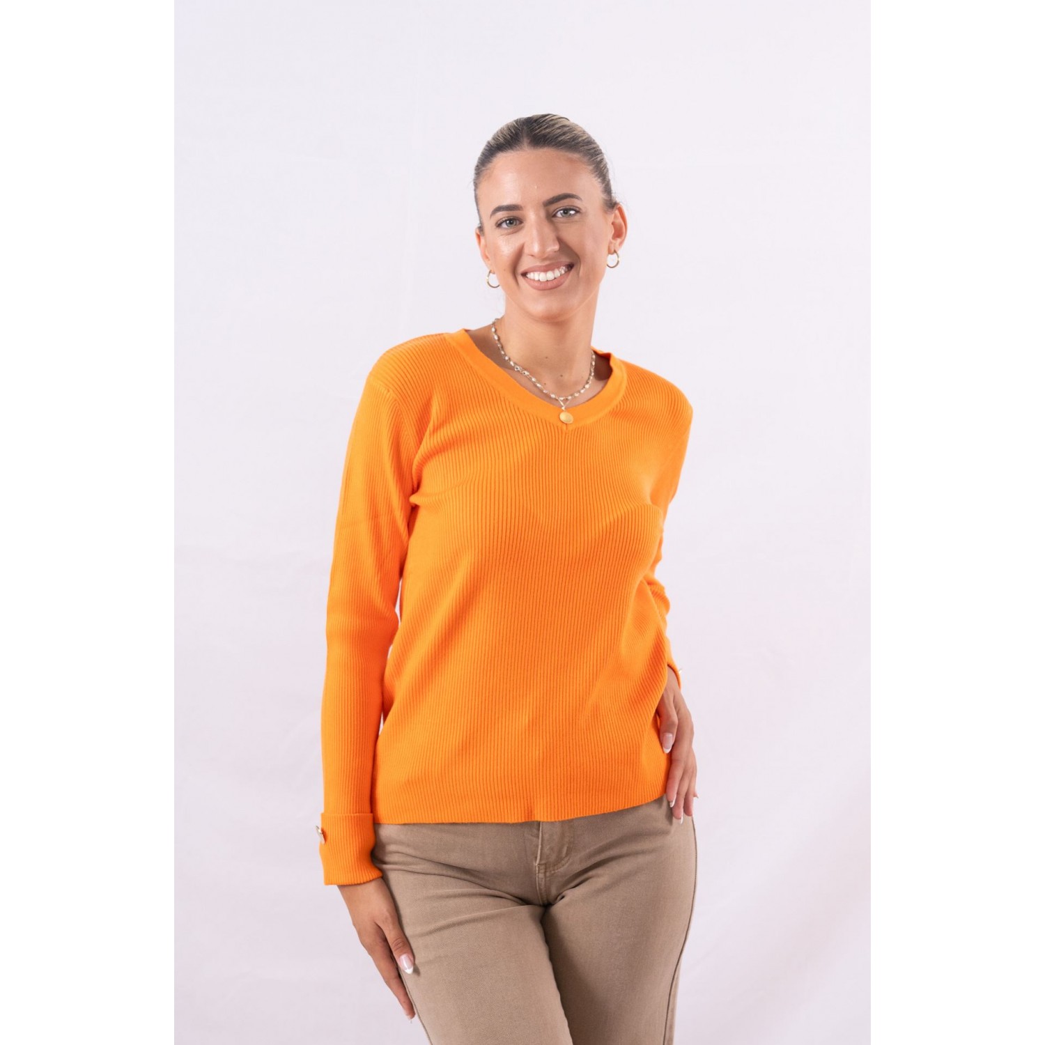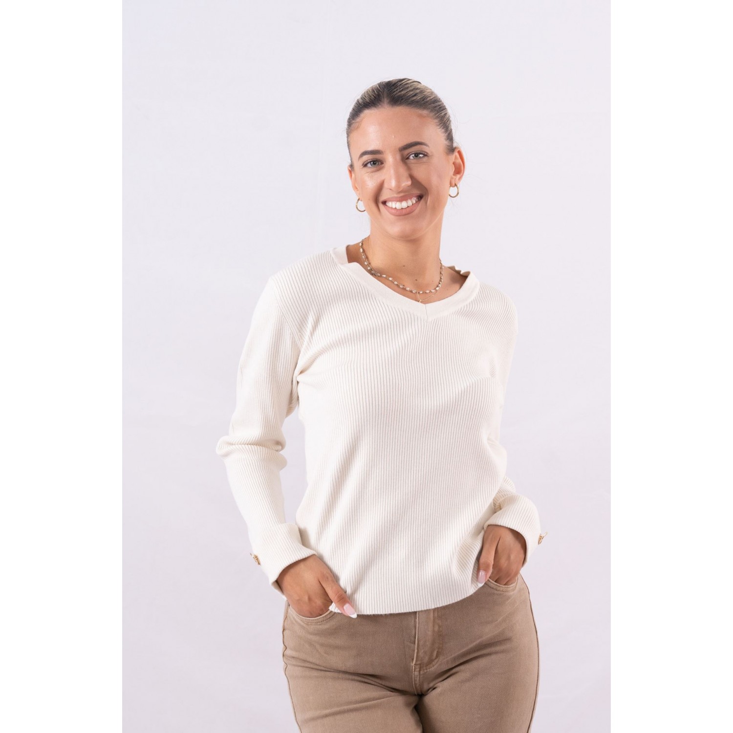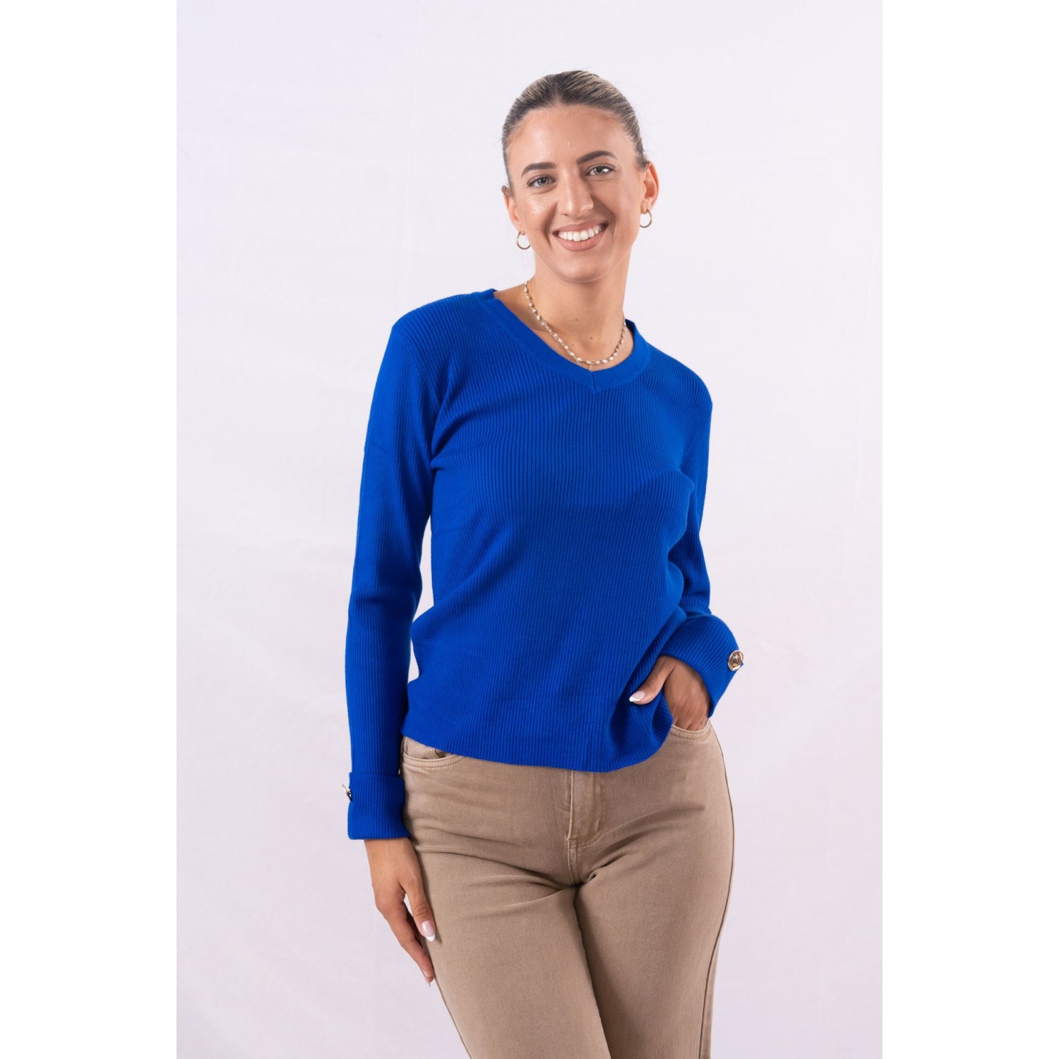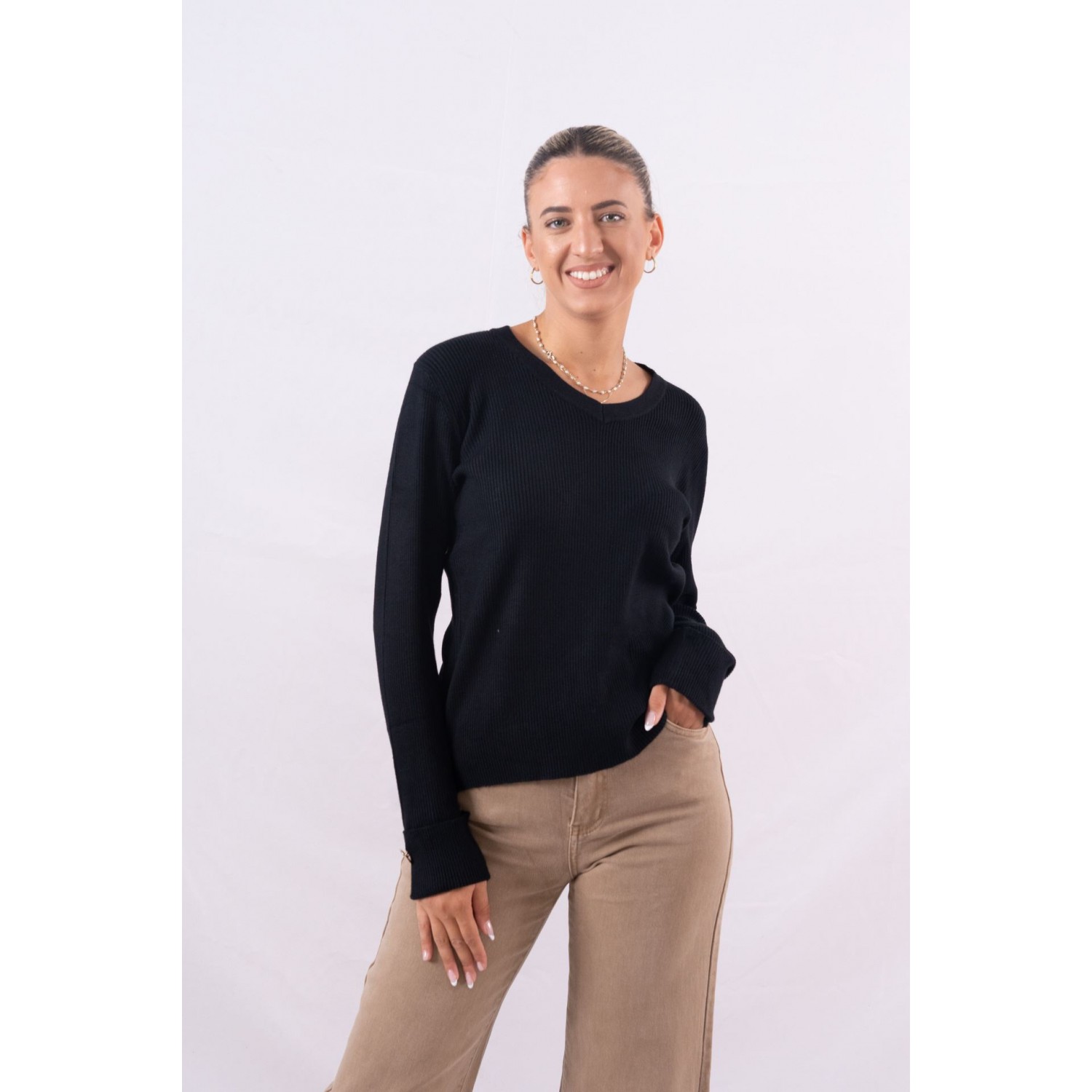 Πουλόβερ ριπ με V ντεκολτέ. Διαθέτει διακοσμητικά κουμπιά στα μανίκια. Νεανικά, sexy και minimal τα μπλουζάκια με ύφανση rib αποτελούν το τελευταίο trend της φετινής σεζόν. Θα τα βρεις σε γήινα και βασικά χρώματα όπως nude, navy αλλά και μαύρο , ενώ η στενή τους γραμμή κολακεύει και αναδεικνύει το σώμα. Για ένα άνετο, αλλά στυλάτο, πρωινό ντύσιμο φόρεσέ το μπλουζάκι με ένα ψηλόμεσο jean, oversized σακάκι και μοκασίνια, ενώ το βράδυ θα ταιριάξει τέλεια με στενές φούστες και μπότες πάνω από το γόνατο.