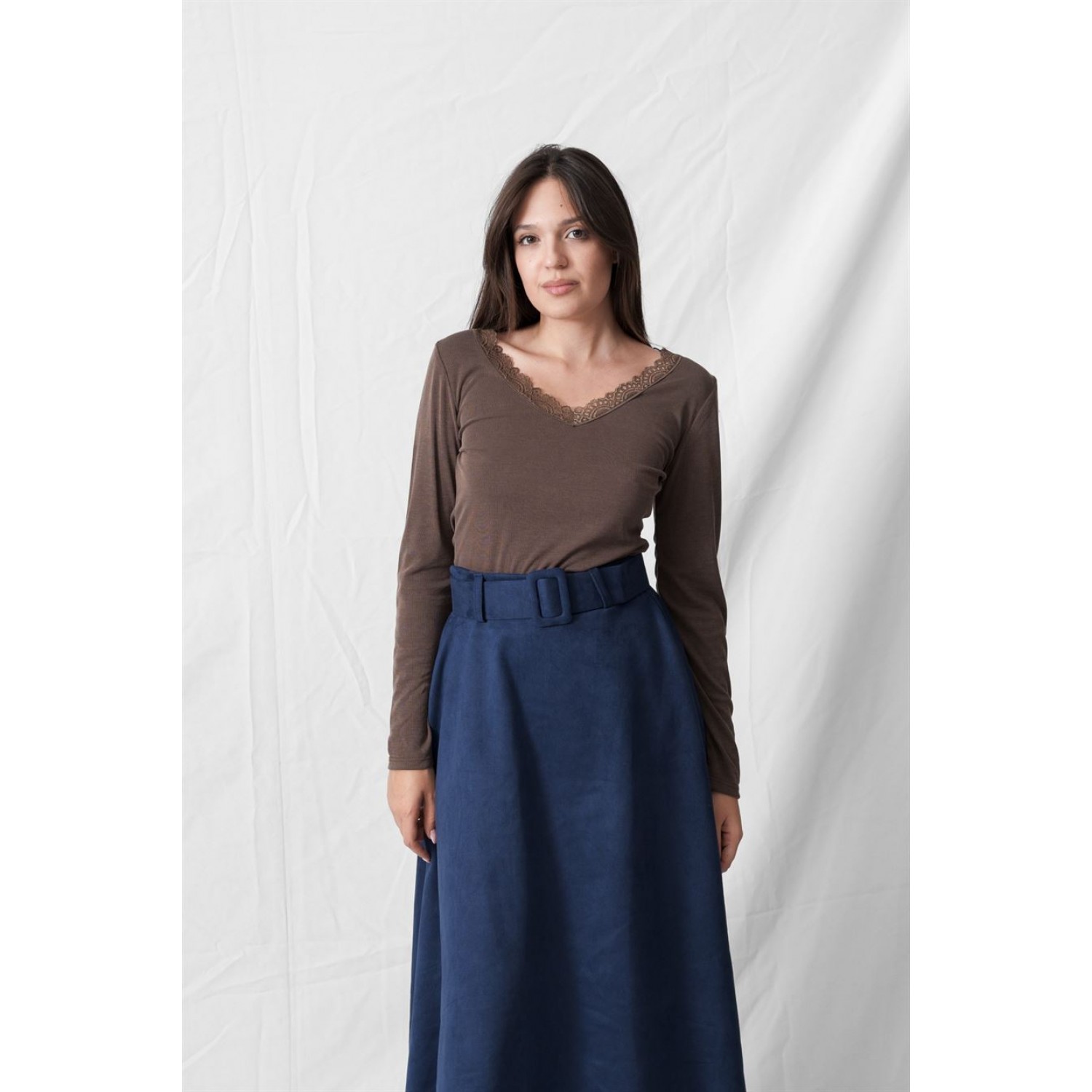 Φούστα σουέτ με λάστιχο στη μέση και ζώνη που ρυθμίζεται . Για να συνδυάσεις μια φούστα σουέντ, φόρεσε ένα πλεκτό τοπ, είτε cropped είτε μακρύτερ..