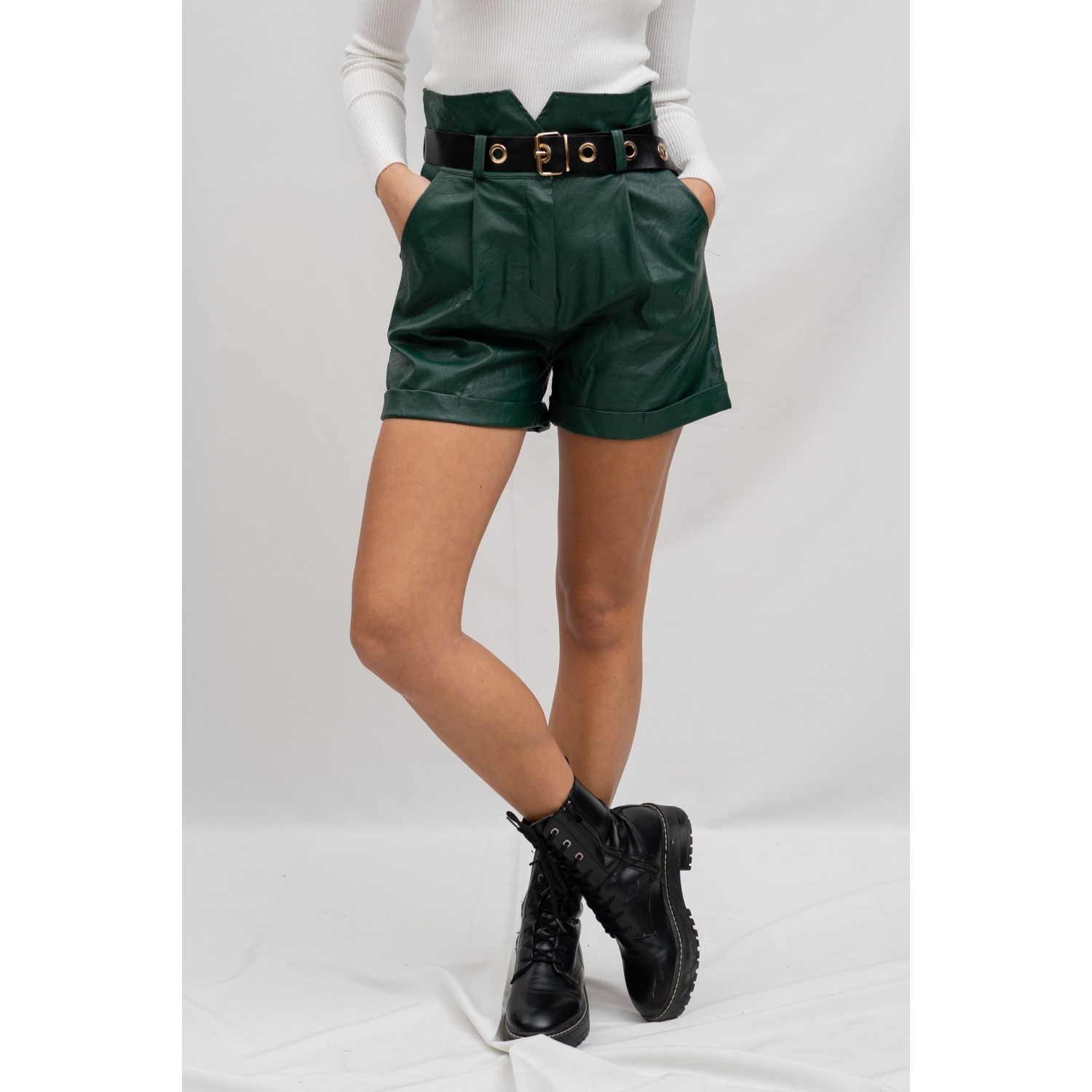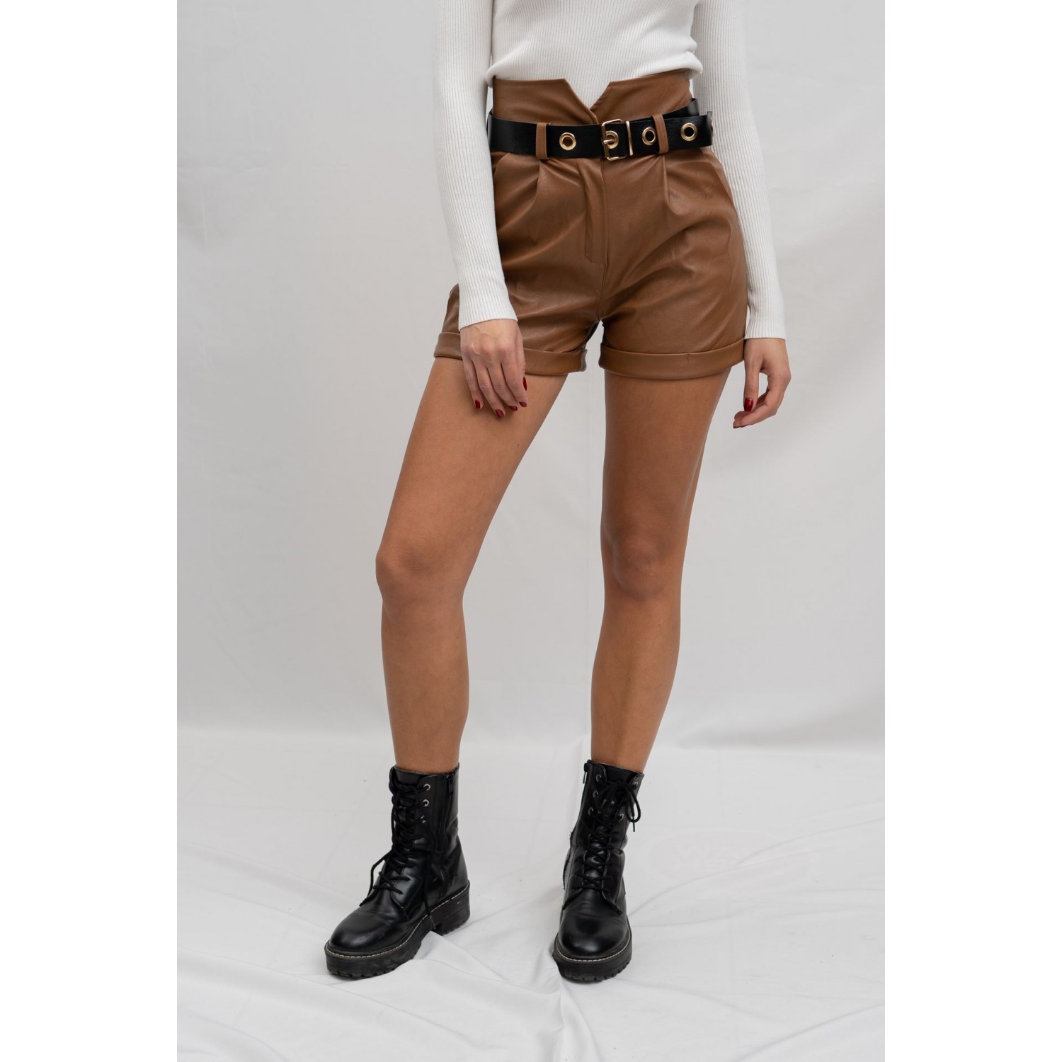 Σορτς δερματίνη με πιέτες. Κλείσιμο με φερμουάρ και μεταλλικό κουμπί. Έχει ζώνη που ρυθμίζεται. Φόρεσε το δερμάτινο σορτσάκι σου με ένα λεπτό μακρυμάνικο τοπ ή πουκάμισο βάζοντας από μέσα την μπλούζα σου μόνο από τη μπροστινή μεριά. Μπορείς να ολοκληρώσεις το look σου με φλατ δερμάτινα μποτάκια.