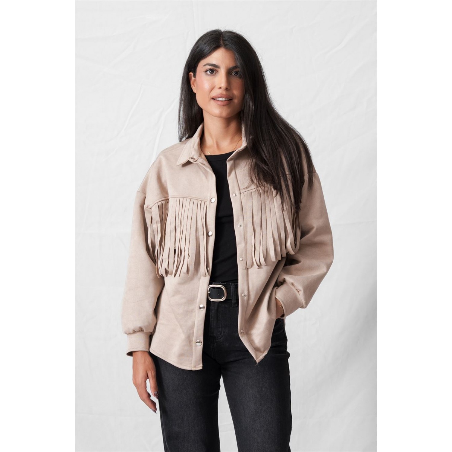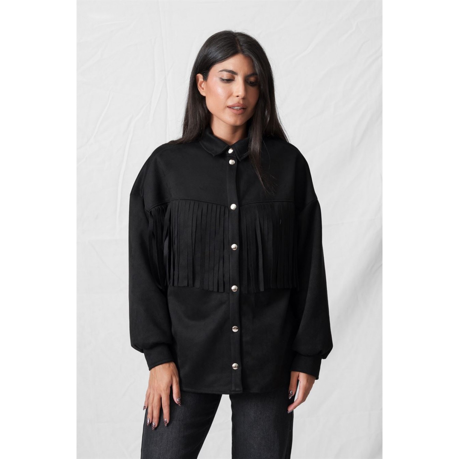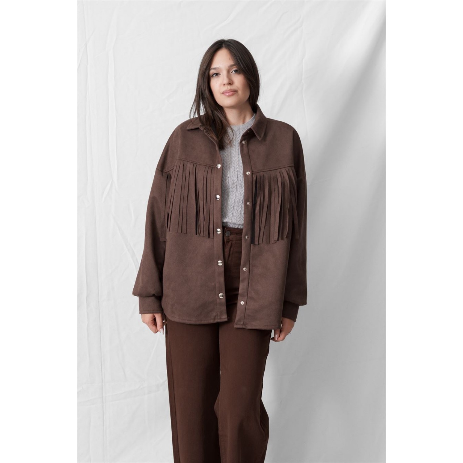 Ζακέτα σουέντ με κρόσσια και κλείσιμο με κουμπιά. Κάθε φθινόπωρο η μόδα επαναπροσδιορίζει τις υφές και τις σιλουέτες που θα κυριαρχήσουν στην καθημερινότητά μας. Ανάμεσα στα υλικά που έχουν αναδειχθεί ως αληθινό statement του φθινοπώρου 2025, το σουέτ κατέχει ξεχωριστή θέση. Με τη βελούδινη υφή του, την πολυτελή όψη αλλά και τη διαχρονικότητά του, το σουέτ επιστρέφει δυναμικά, αποπνέοντας κομψότητα και ανεπιτήδευτη θηλυκότητα. Το σουέτ δεν είναι απλώς ένα ύφασμα, αλλά ένα υλικό που αποπνέει χαρακτήρα. Το φθινόπωρο, όπου η φύση ντύνεται με ζεστές γήινες αποχρώσεις, ταιριάζει απόλυτα στη διάθεση της εποχής. Η μαλακή, ματ υφή του προσφέρει μία αίσθηση πολυτέλειας χωρίς υπερβολή, ενώ οι designers το προτείνουν σε όλα τα κομμάτια της γκαρνταρόμπας, από καμπαρντίνες και φορέματα μέχρι τσάντες και μπότες, εξυμνώντας τη διαχρονικότητα και κομψότητά του. Όσον αφορά στους συνδυασμούς που μπορείς να δημιουργήσεις, οι επιλογές ποικίλουν και είναι άπειρες. Με φορέματα και φούστες, τζιν παντελόνια και υφασμάτινες παντελόνες. Ένα suede πανωφόρι πρόκειται να αναβαθμίσει αμέσως το αποτέλεσμα.